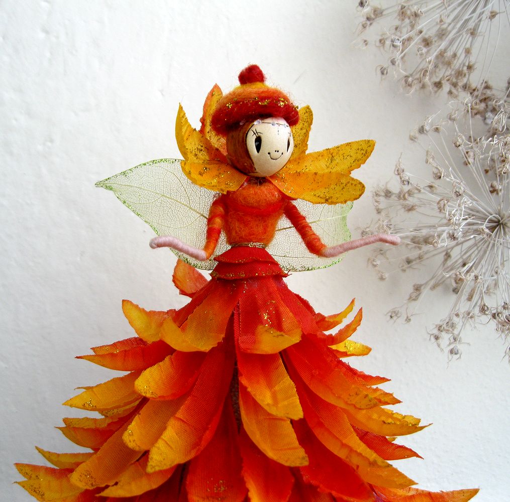 Sukýnka je plná plátků oranžové chryzantémy z látkových květů, tělo z ovčího rouna a keramické hlavičky. Víla stojí na drátovaném podstavci.