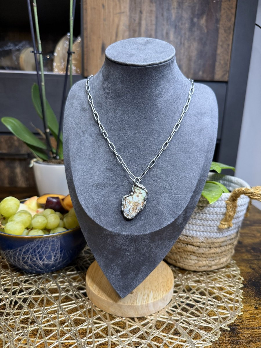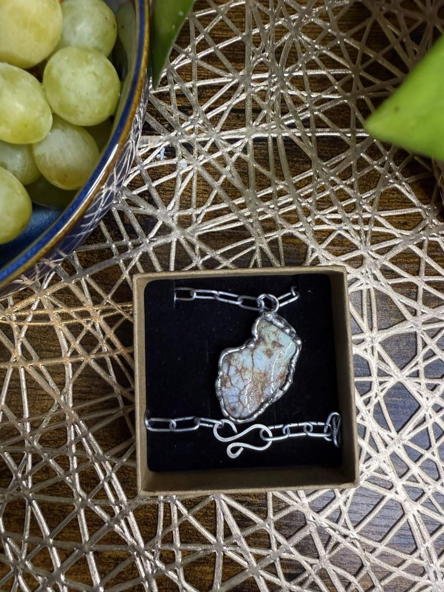 Minerál je zasazený do bezolovnatého cínu. Patinováno černou patinou a vybroušeno kovovou vatou. Celý šperk ošetřen antioxidačním olejem a naleštěn karnaubským voskem. Řetízek z nerezové oceli. Na přání mohu řetízek vyměnit za šňůrku.