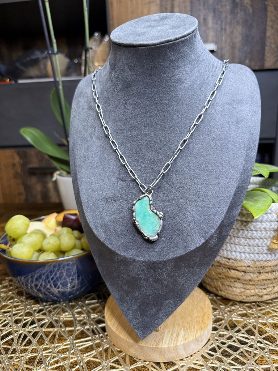 Náhrdelník z CHRYZOPRASU, který je oboustranný. Každá z jeho stran je unikátní a lze nosit dle nálady, ale vždy bude zajímavým doplňkem.