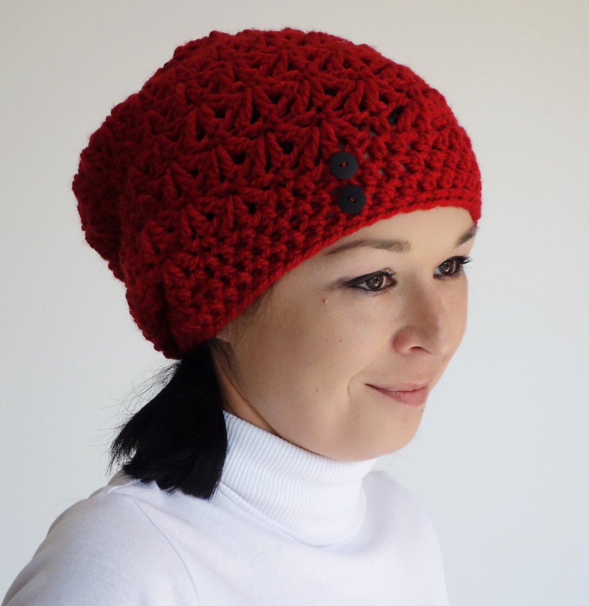 Červená háčkovaná čiapka s dvomi čiernymi gombičkami.
