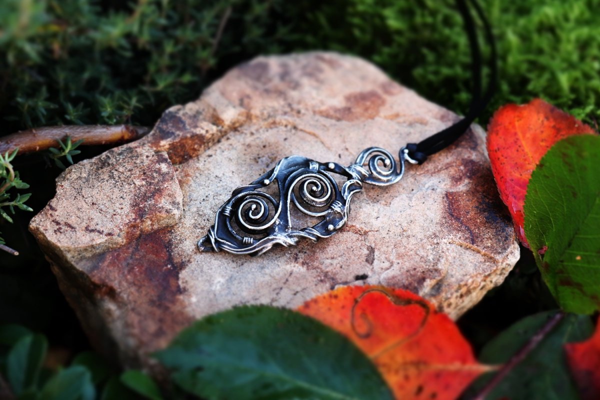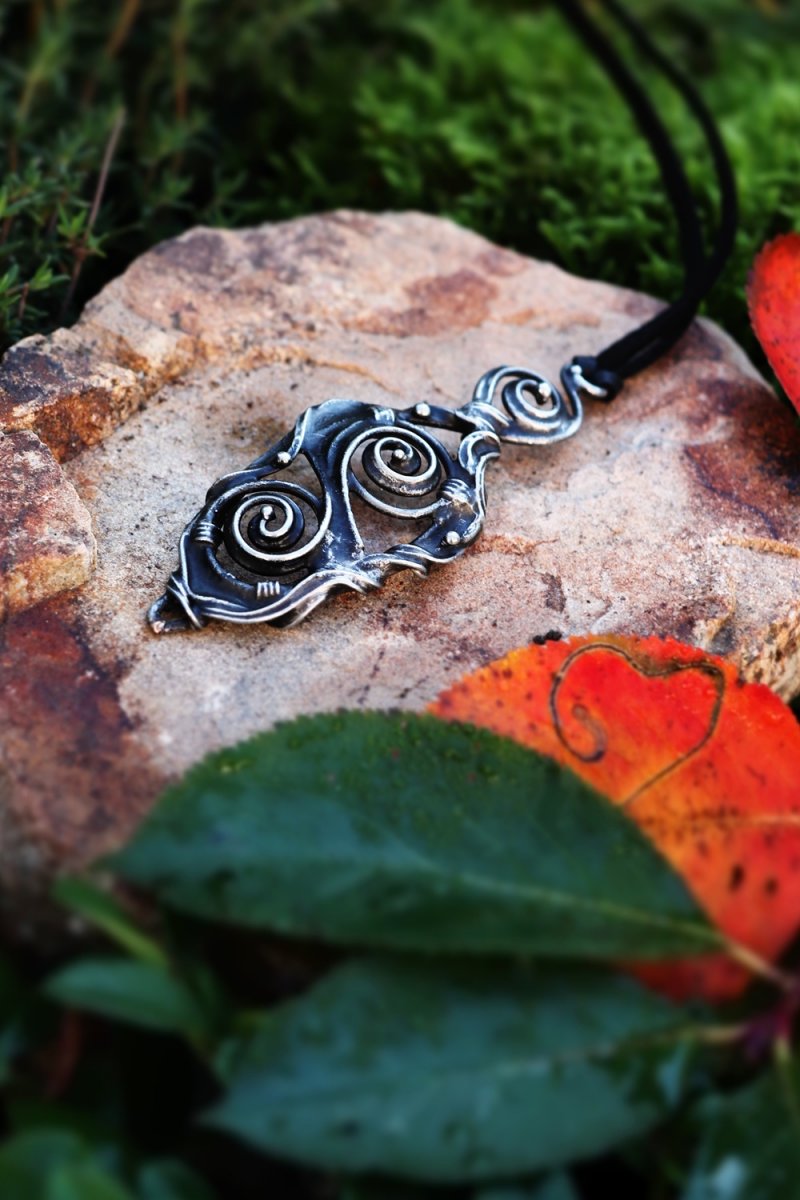Originální ručně cínovaný šperk s mystickým motivem spirál, zavěšený na černé kožené šňůrce. Spirála je pradávný symbol nekonečna, životní cesty a obnovy. Přináší sílu, ochranu a připomíná, že každý konec je začátkem nového cyklu. Tento výrazný šperk je ideální pro ženy, které milují mystiku, keltské tradice a chtějí nosit šperk s hlubším významem.