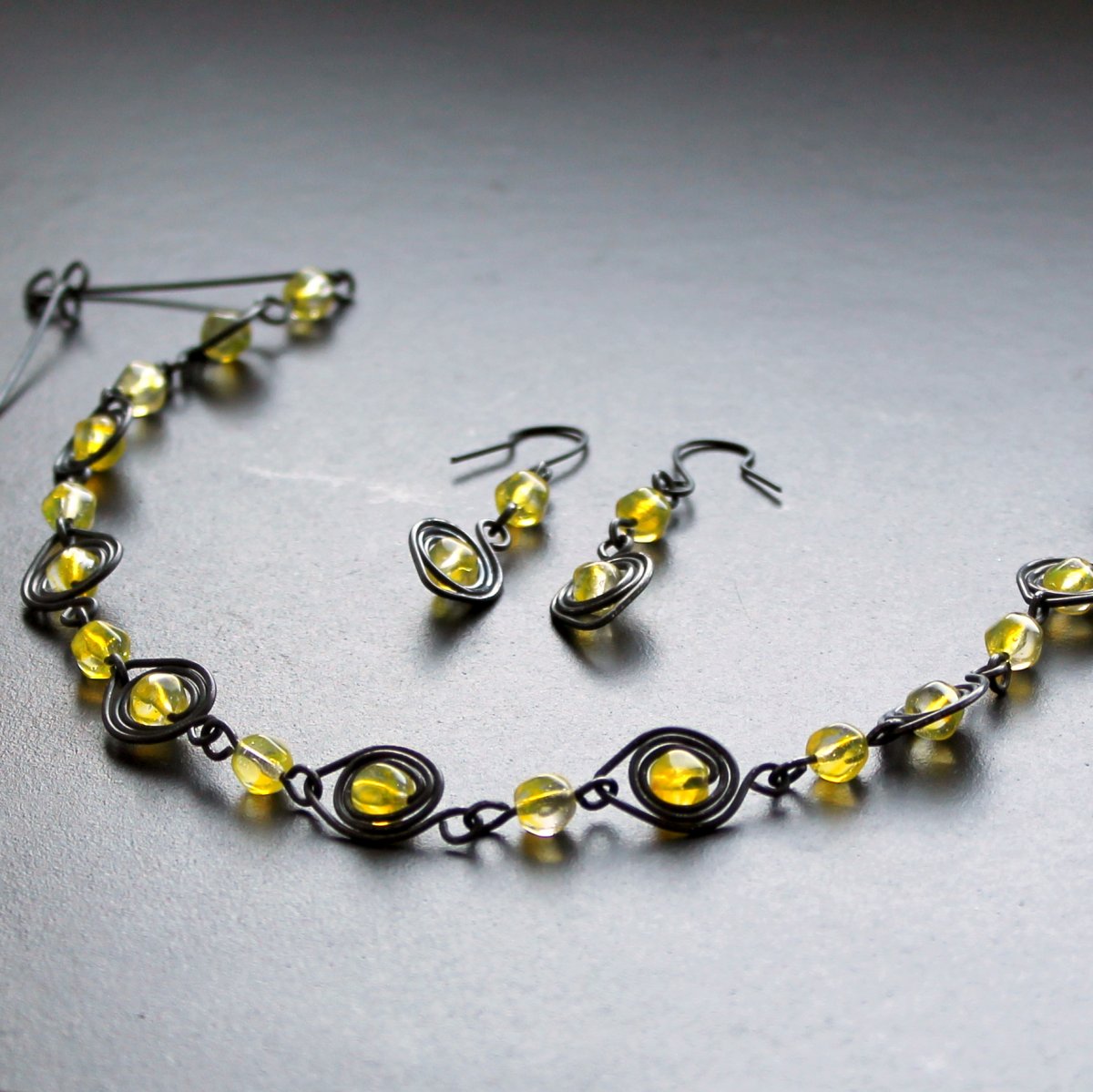 Drátovaný náhrdelník a náušnice z černého 1 mm hrubého drátu se žlutýmii 0,5 cm velkými mačkanými korálky.