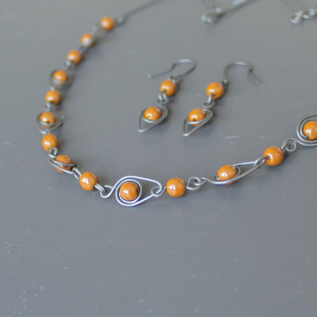 Drátovaný náhrdelník a náušnice z černého 1 mm hrubého drátu s hnědými kuličkami. Velikost korálku je cca 0,6 cm.