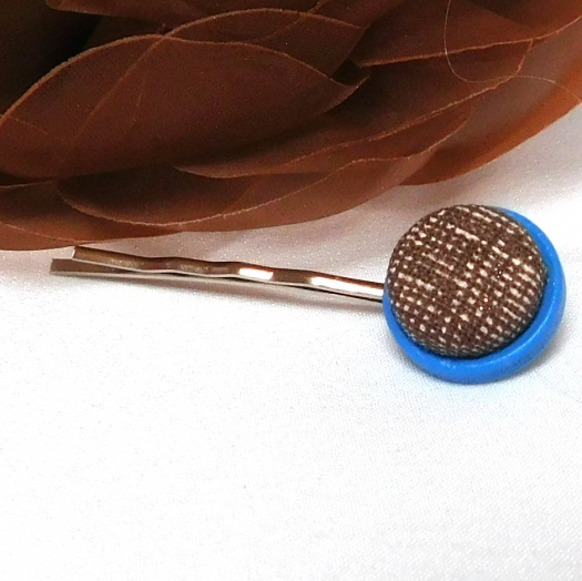 Stříbrná sponka do vlasů ozdobená modrým dřevěným knoflíkem a hnědobílým látkovým buttonkem. Délka kovové části je cca 4,5 cm, průměr kulaté ozdoby je cca 1,5 cm.
