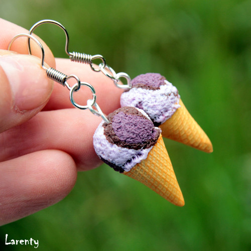 Naušnice představuje kopečkovou zmzlinu v kornoutu, která je kombinací čokoládové a ovocné dvojbarevné zmrzliny.