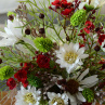 V keramické dózičce jsou umělé květiny se zelení se sušinou jemně . Doplněno o jutové copánky.