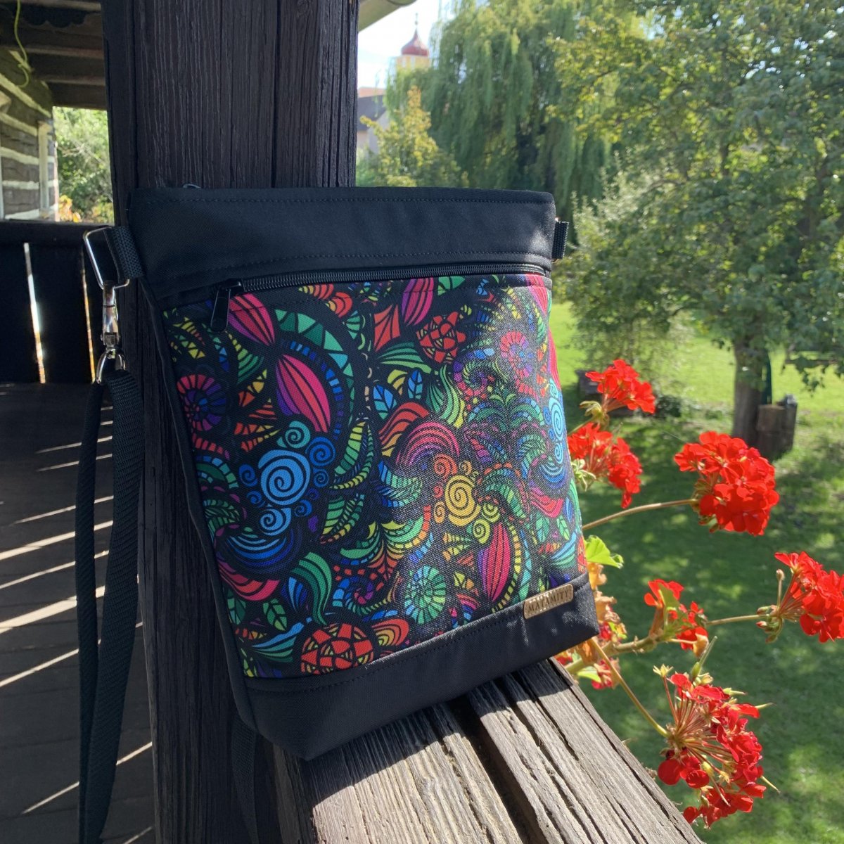 Crossby kabelka ušita z batohoviny černé a vzorované kočárkoviny, která je voděodolná.