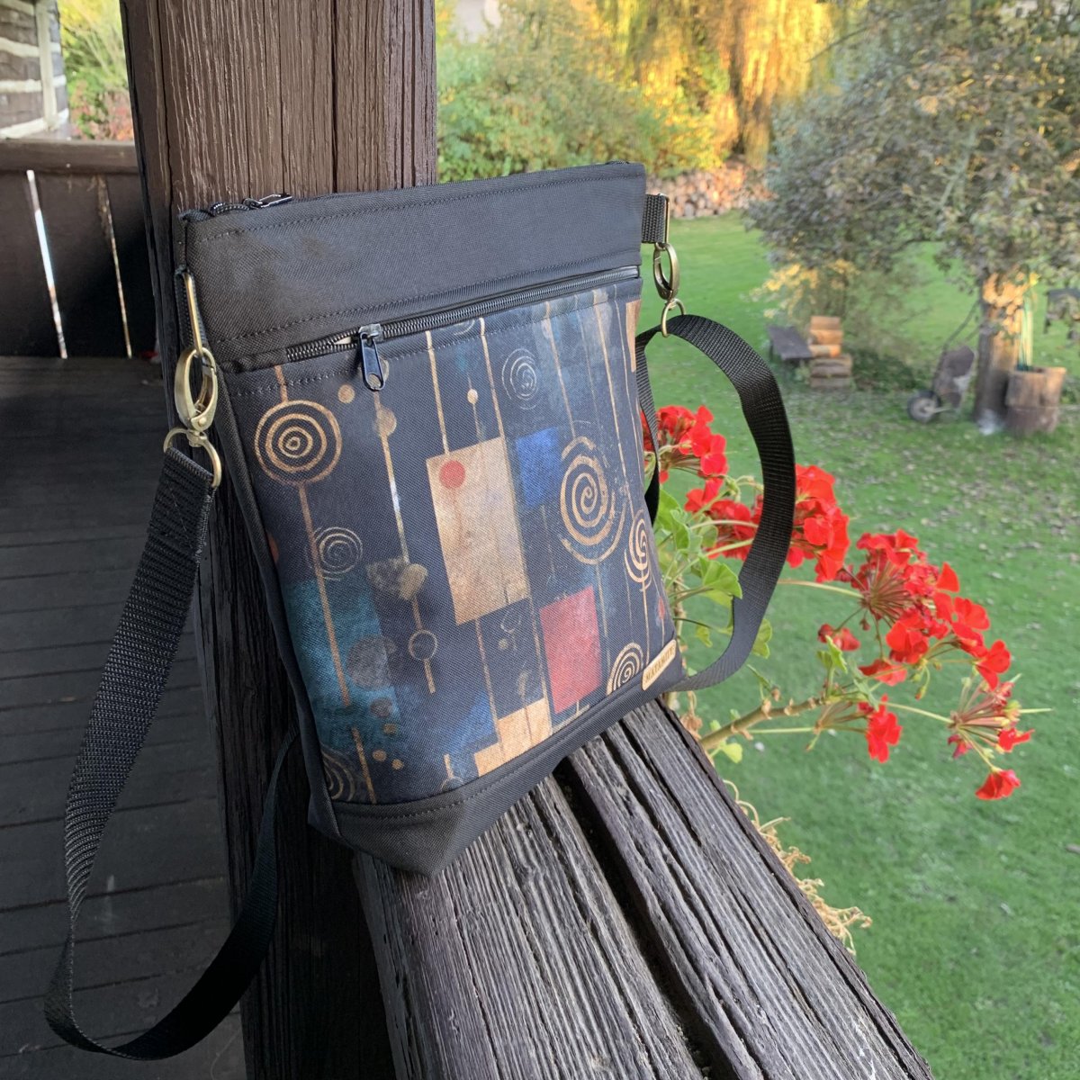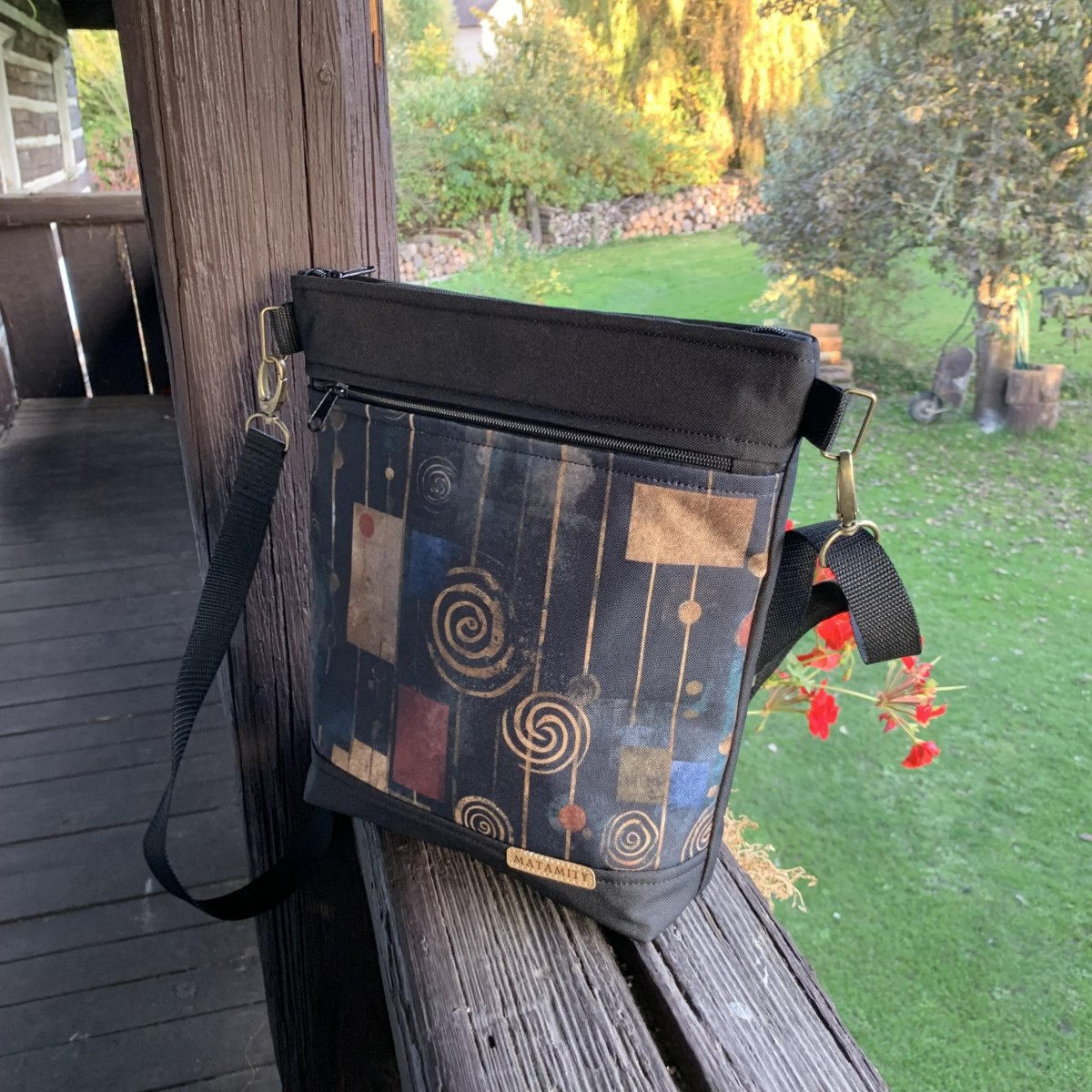 Crossby kabelka ušita z batohoviny černé a vzorované kočárkoviny, která je voděodolná.