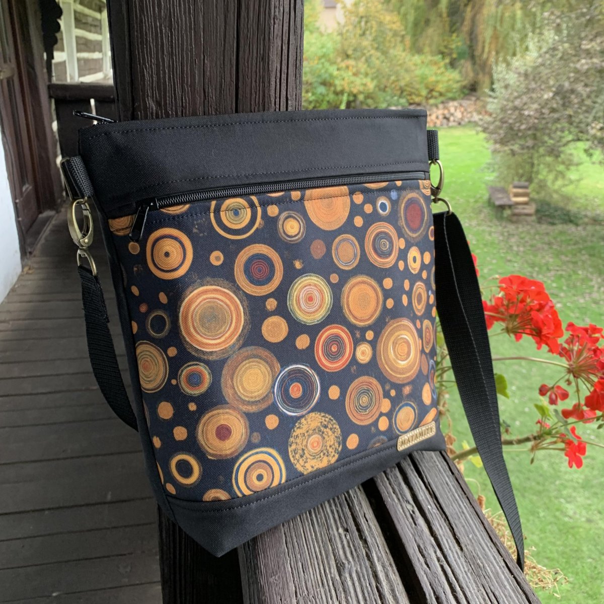 Crossby kabelka ušita z batohoviny černé a vzorované kočárkoviny, která je voděodolná.