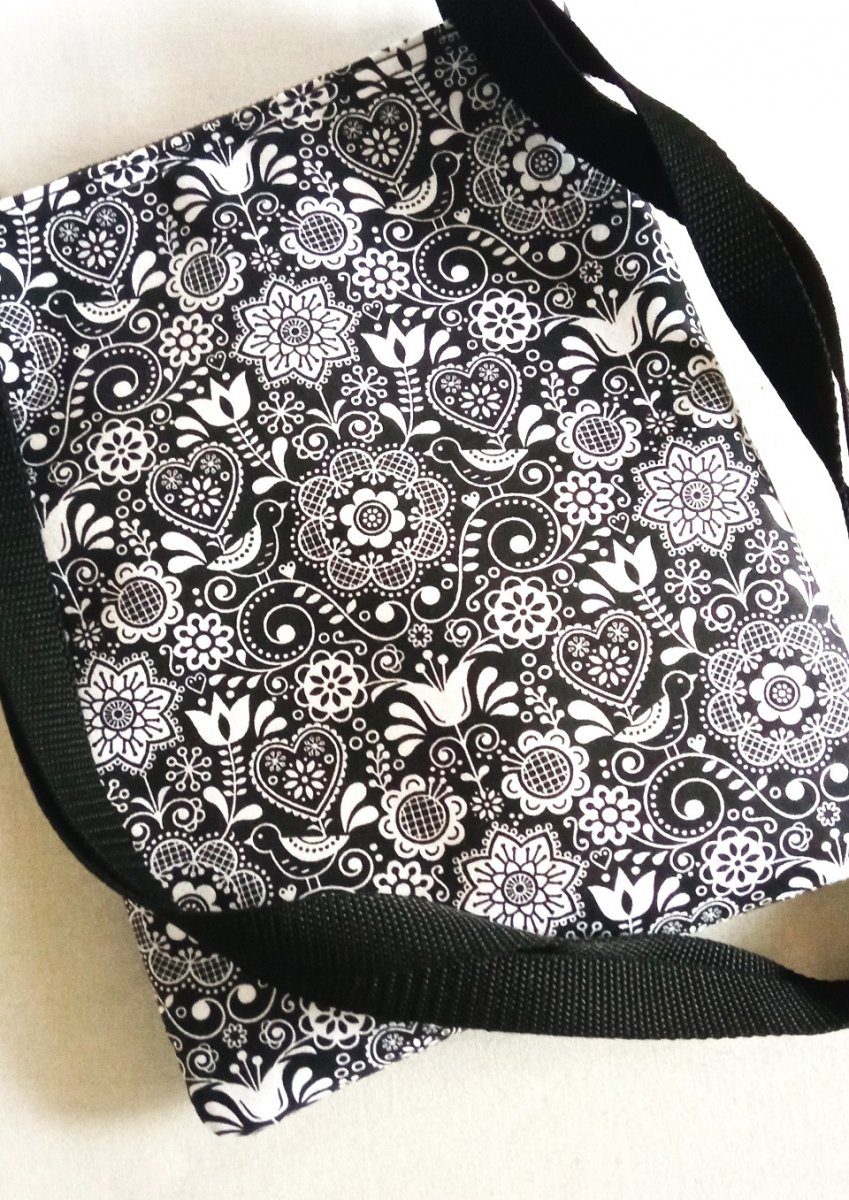 crossbody je ručně šitá z pevné černé 100%bavlny,a bavlny vzorované,vyztužená,uvnitř bavlněná podšívka,zapínání na zip,popruh černý a nastavitelný,