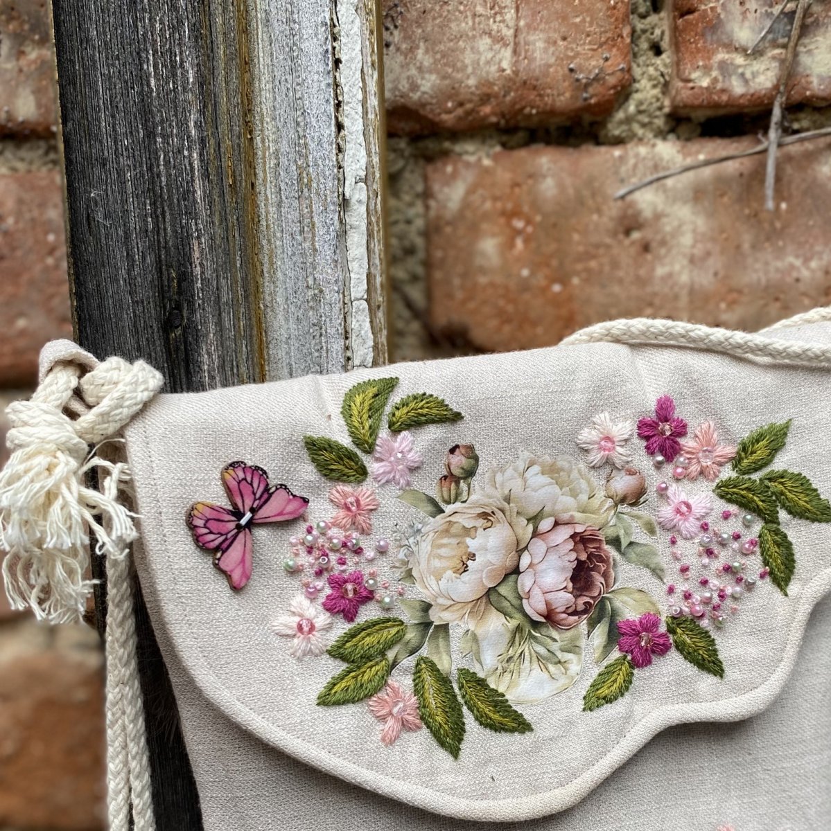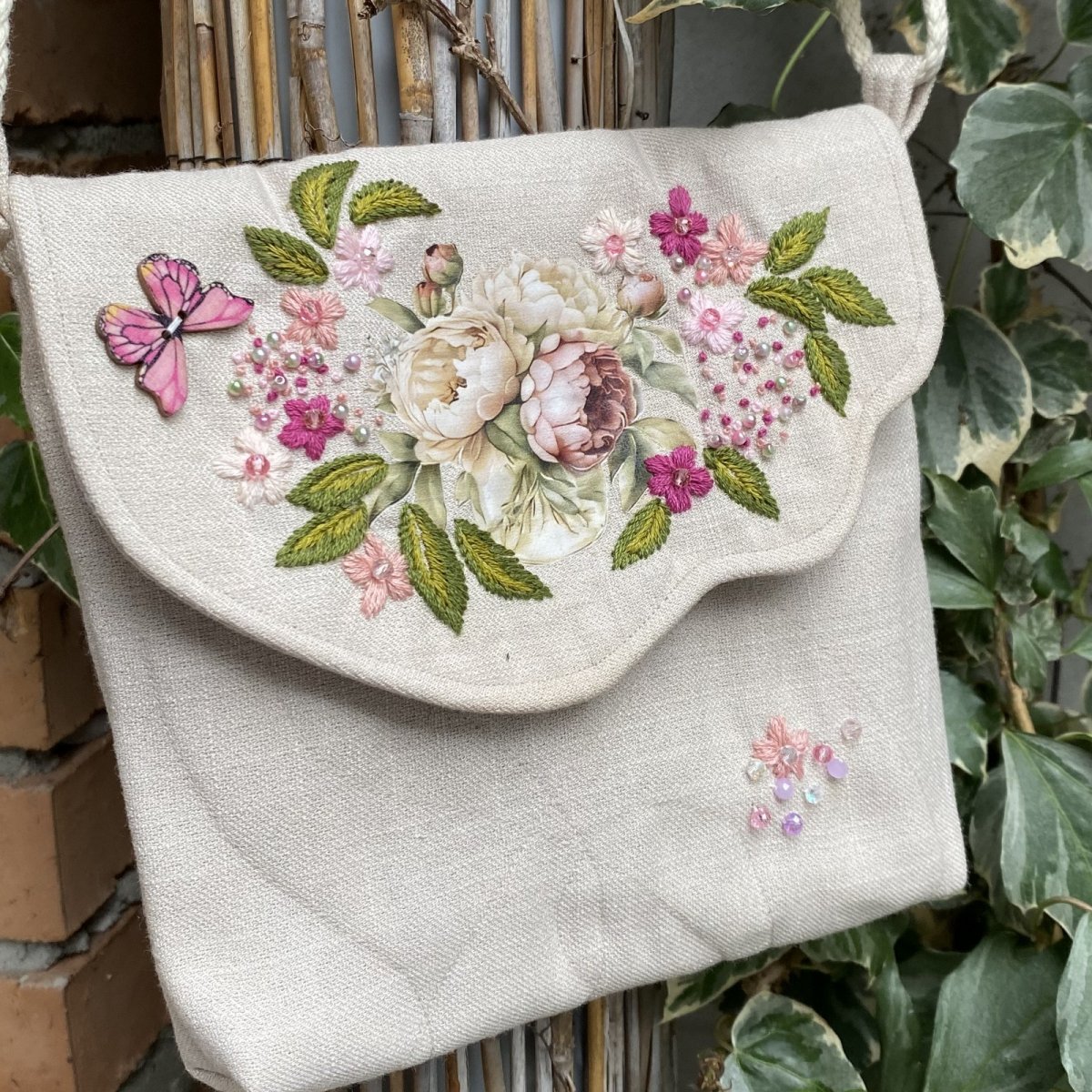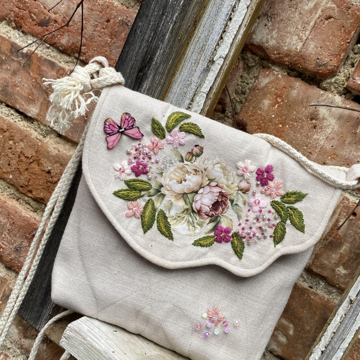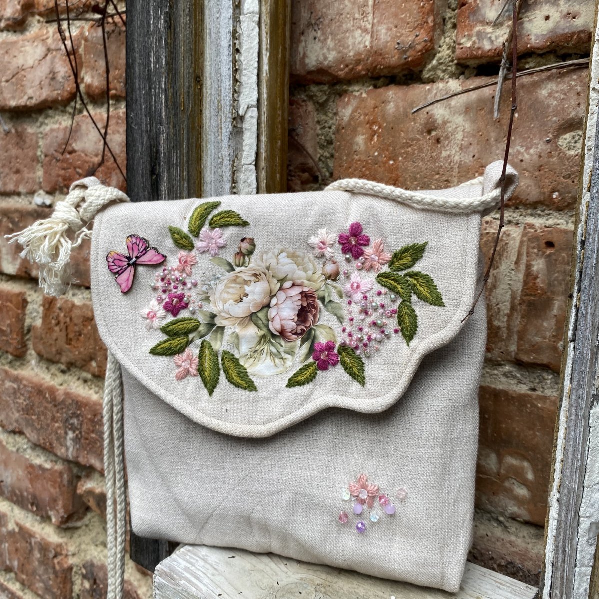 Tvarově zajímavou klopu zdobí nažehlená romantická aplikace, která je celá bohatě doladěna originální ruční výšivkou, korálky a knoflíky-motýlky.