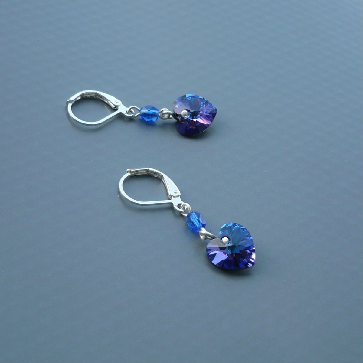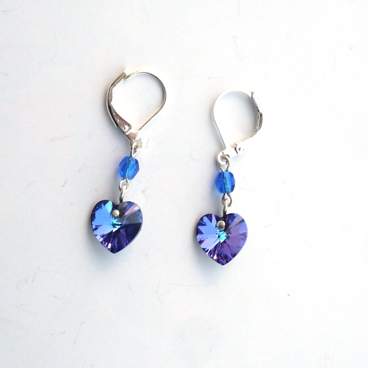 Precizně vybroušené malé Swarovski srdíčko odstínu crystal helio (nádherné měnivé modro fialové) a modrý skleněný broušený korálek jsou zavěšeny rovnou na uzavíratelném zapínání, tzv. klapka.