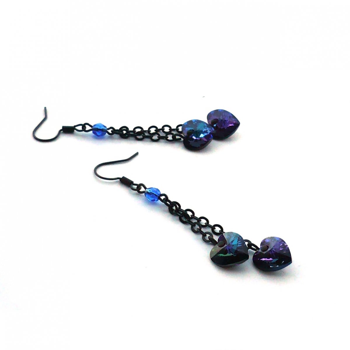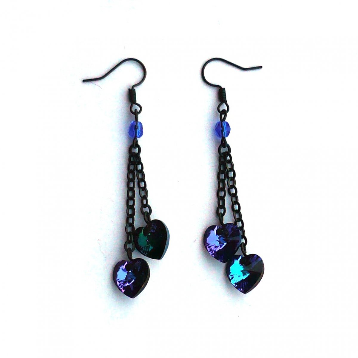 Precizně vybroušená malá Swarovski srdíčka v odstínu crystal helio (nádherné měnivé modro fialové) jsou zavěšeny na bižuterním řetízku černé barvy. V horní části se řetízky sbíhají pod modrý broušený skleněný korálek.