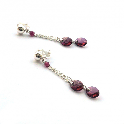 Precizně vybroušené malé Swarovski oválky v odstínu Crystal Lilac Shadow jsou zavěšeny na bižuterním řetízku stříbrné barvy. V horní části se řetízky sbíhají pod fialový broušený skleněný korálek.