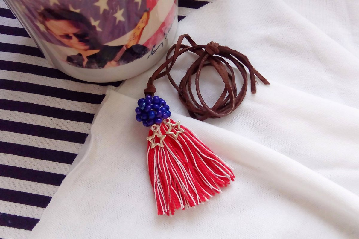 Textilní střapeček s korálky a kovovými přívěsky na kožené šňůrce (délka cca 70 cm).
