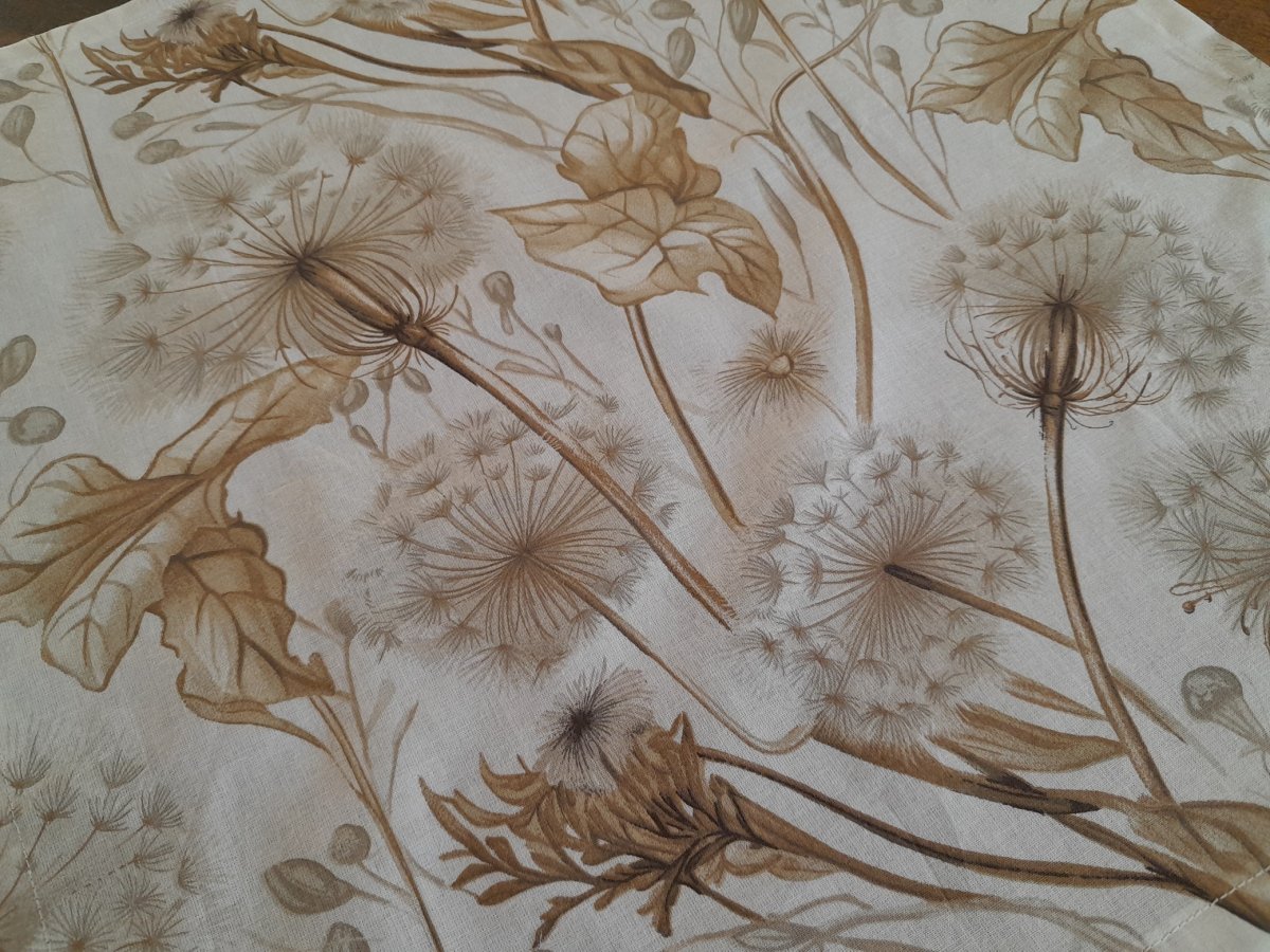 Nabízím středový čtvercový ubrus, šitý z bílé bavlněné látky s béžovým vzorkem.