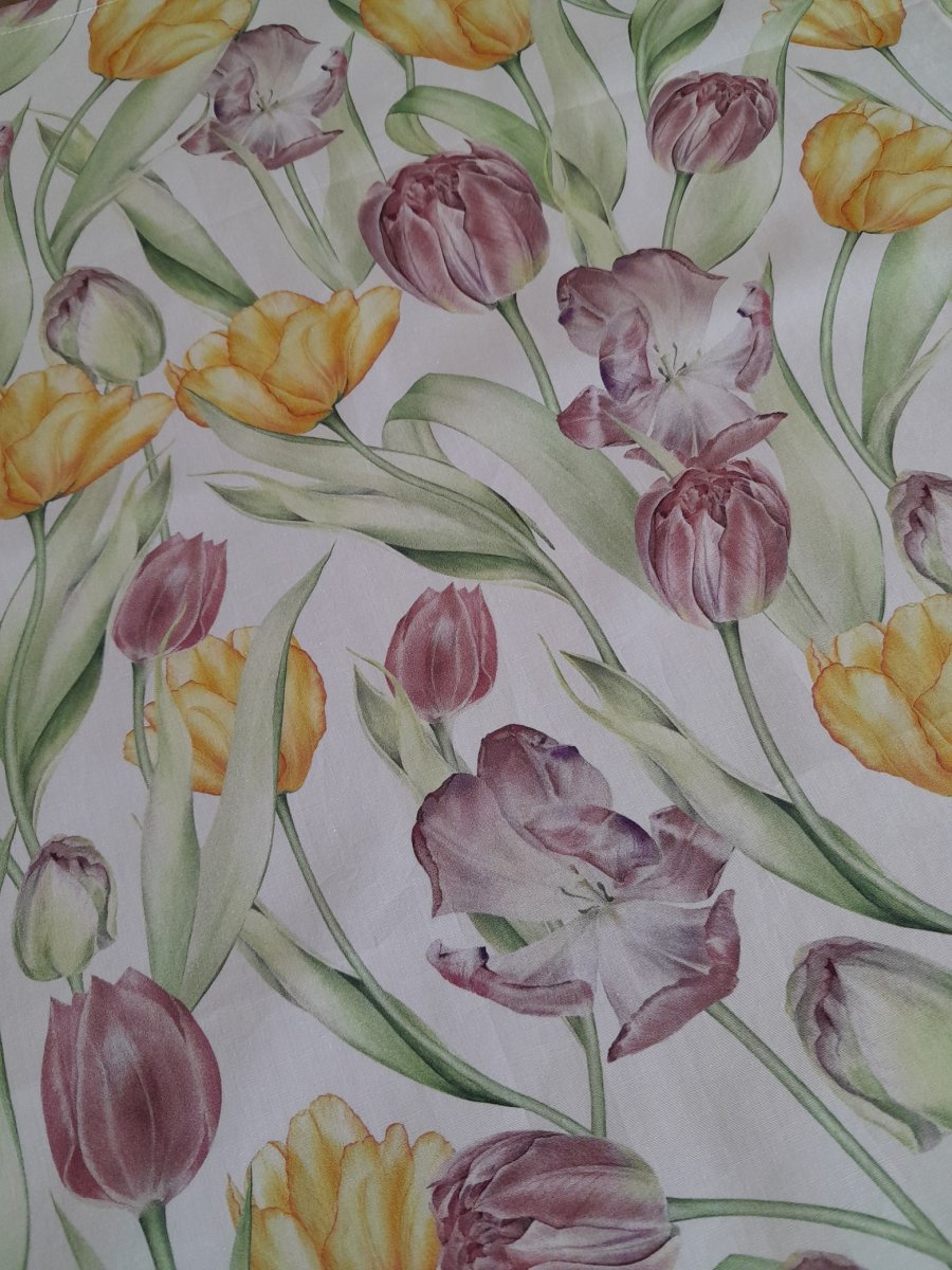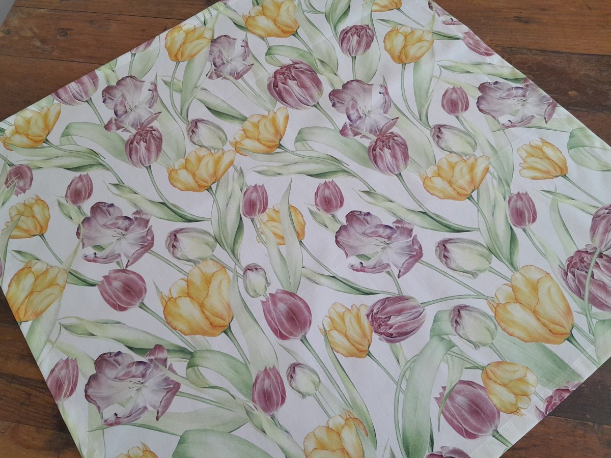 Nabízím středový čtvercový ubrus šitý z úžasné látky plné tulipánků.