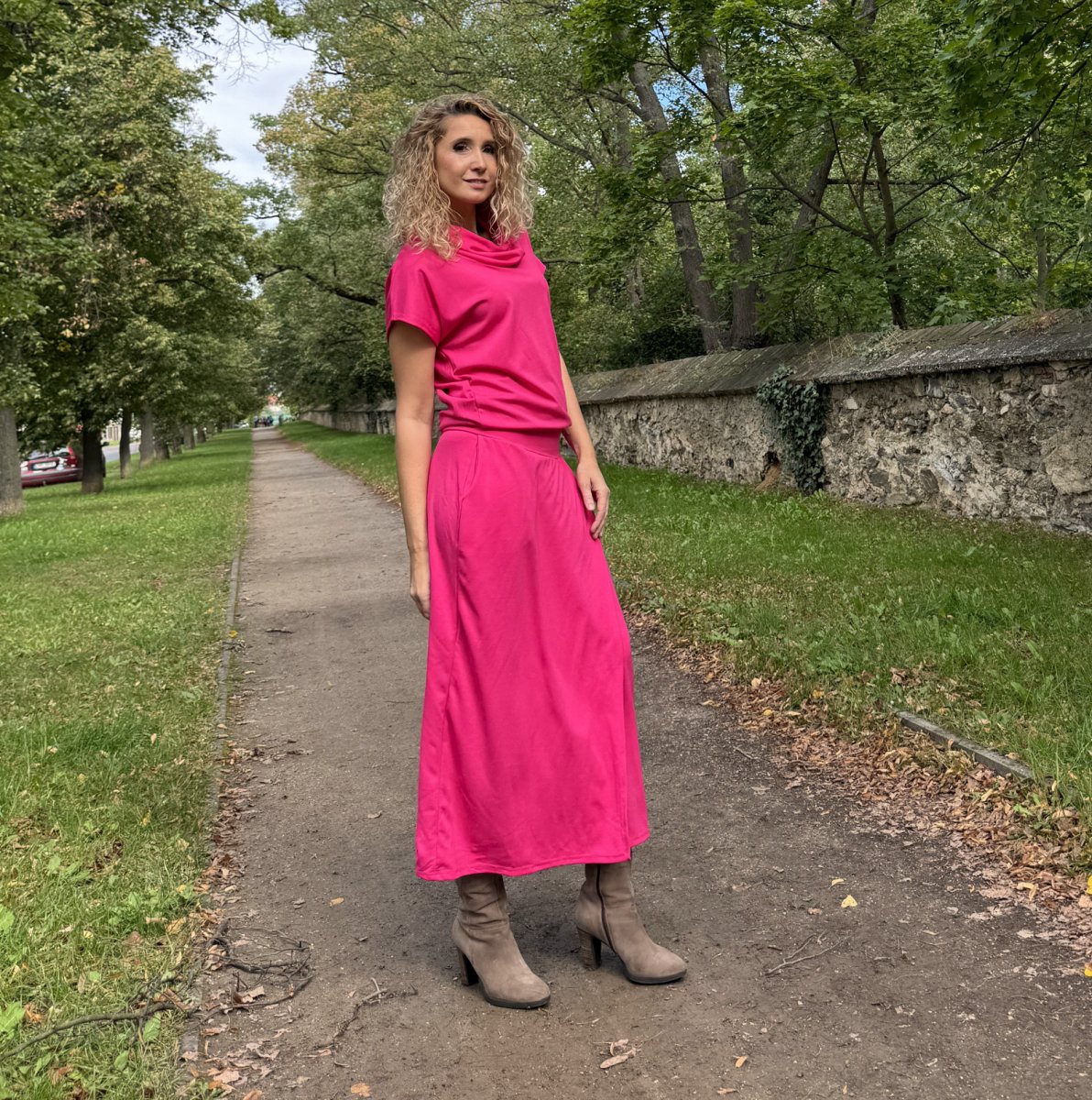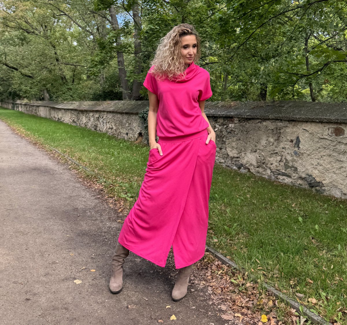 Cyklámen šaty dlouhé s rozparkem
