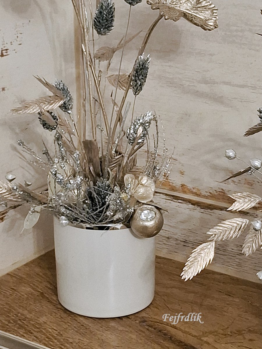 Vánoční aranžmá v keramickém pohárku se stříbrným ráfkem , se sušinou mix a umělými dekoracemi .