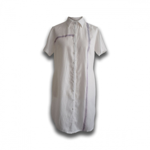 Dlouhá dámská košile polopřiléhavého střihu s košilovým límcem je vyrobena z jemného lněného plátna. Přední díl s légou je zapínaný na dírky a knoflíky a je tvarovaný dvěma prsními záševky. Zadní díl je hladký. Rukávy jsou krátké (pár cm nad loket). Dolní kraj košile je tvarovaný do oblouku. Košile je zdobená dvěma pruhy v PD a jedním v ZD.