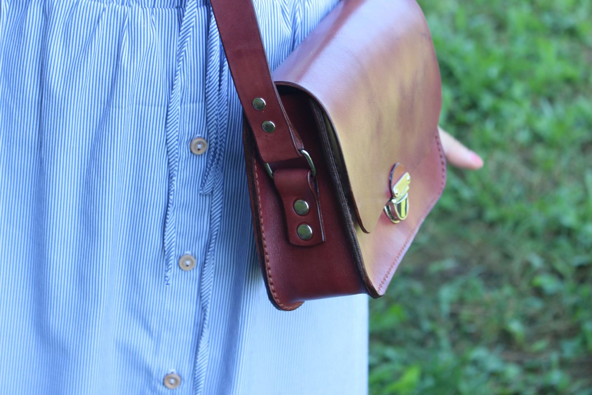 Kabelka je ručně šitá sedlářským stehem z hovězí třísločiněné kůže, tloušťky 2 mm. Kůže je ručně barvená, nalakovaná sedlářským lakem, ošetřená včelím voskem.