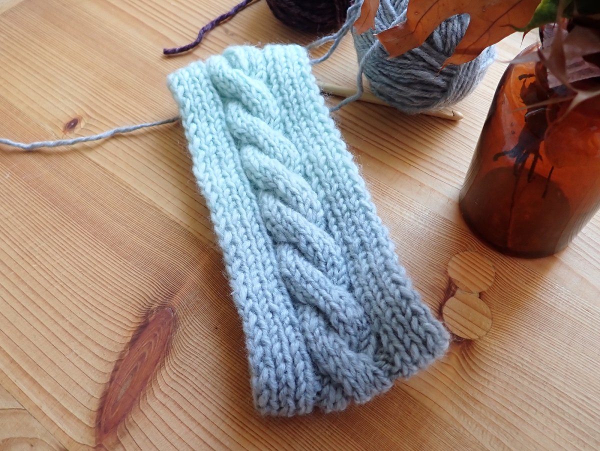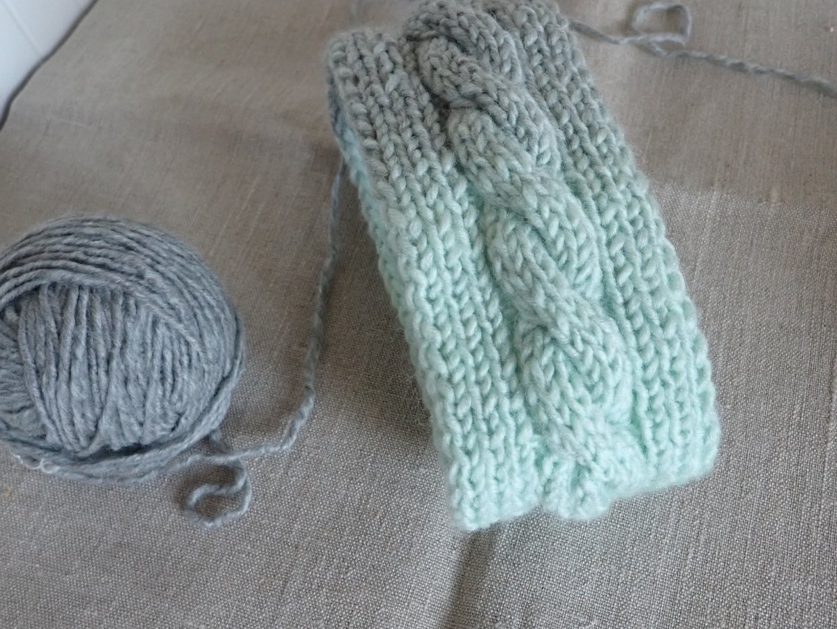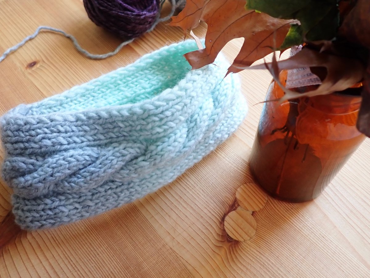 Ručně pletená melírovaná dámská čelenka s copánkem je určená na hlavičku o velikosti 54-56. Široká je 8 cm.