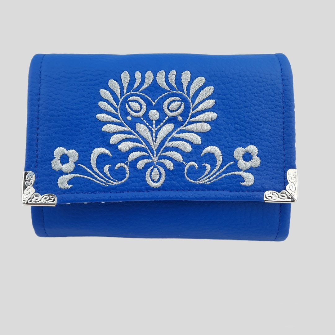 Vyšívaná dámska peňaženka z umelej kože v modrej farbe, zdobená sivou výšivkou vo folklórnych tónoch. Praktická, originálna a veľmi pekná peňažeka, ktorá zaujme svojim dizajnom a určite Vám urobí radosť.