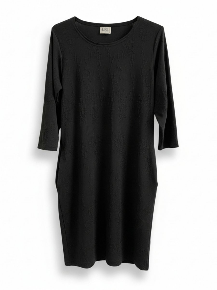 Černé šaty z příjemného úpletu s 3/4 rukávy a praktickými kapsami jsou ideální volbou pro každou příležitost – od pracovního dne po večerní posezení.