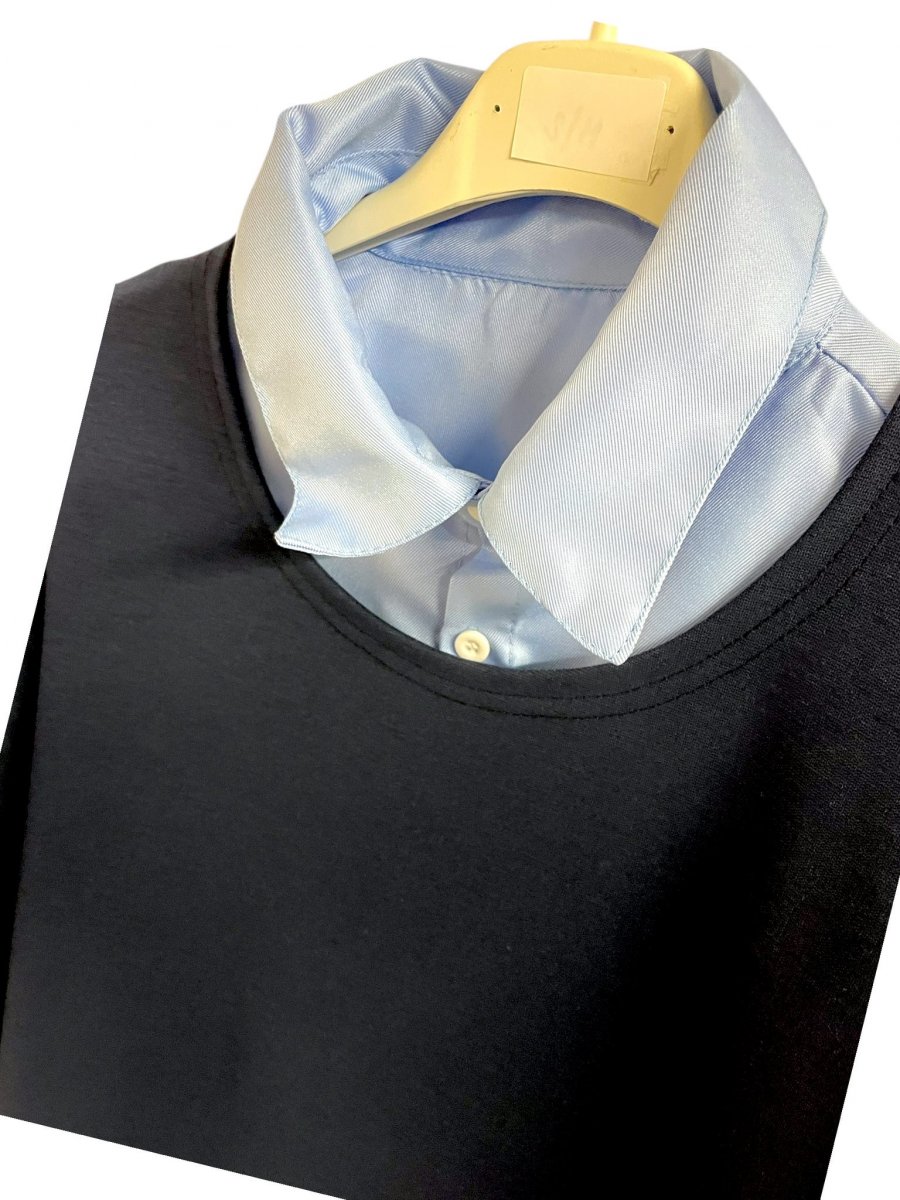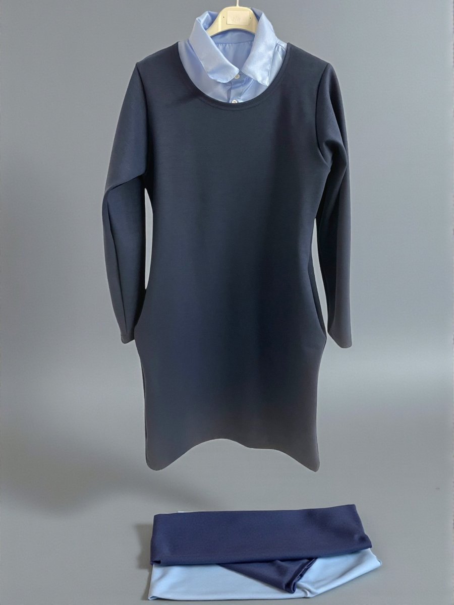 Šaty jsou navrženy z příjemného materiálu (často směs bavlny s elastanem pro pohodlné nošení), který se nezatrhává a drží tvar. Hlavním designovým prvkem je kontrastní světle modrý límec a manžety, které imitují košili pod šaty.
