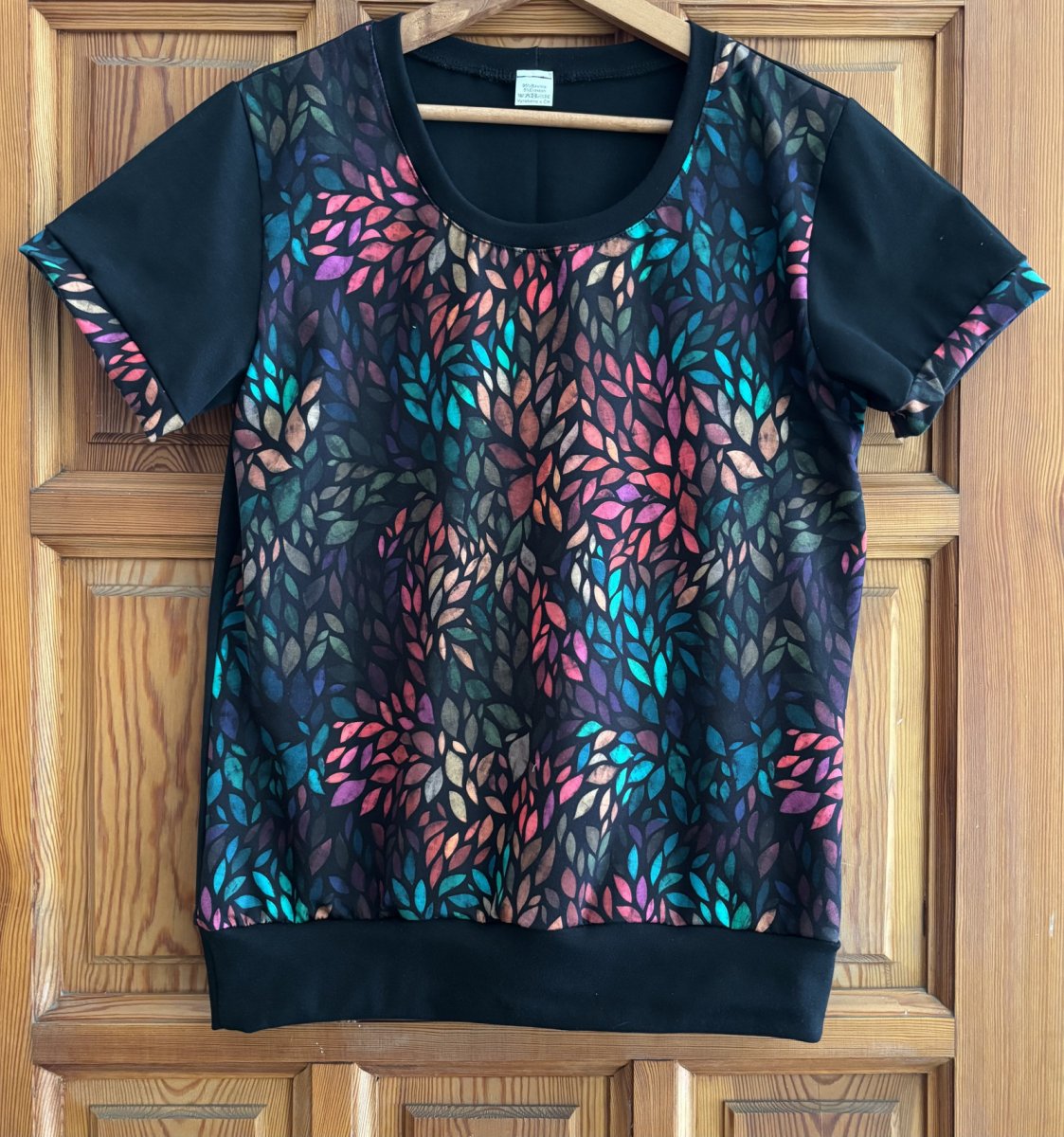 Originální detail: Přední díl zdobí potisk barevných lístků, zatímco zadní díl z jednobarevného černého úpletu vytváří zajímavý kontrast.