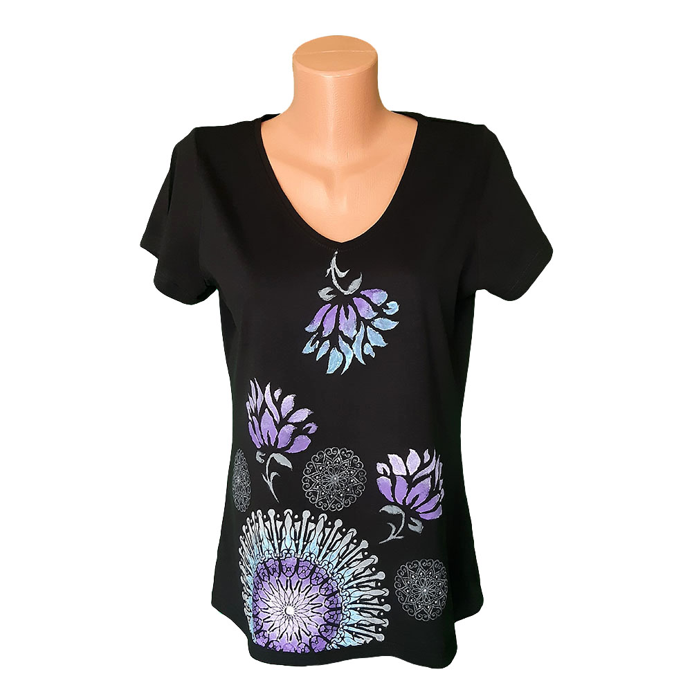 Ručně malované dámské černé tričko s krátkým rukávem. Malování světlemodou, světle i tmavě fialovou, šedou a bílou barvou.