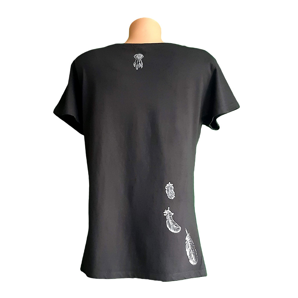 Dámské černé tričko s krátkým rukávem ručně malované a tištěné bílou a červenou barvou.