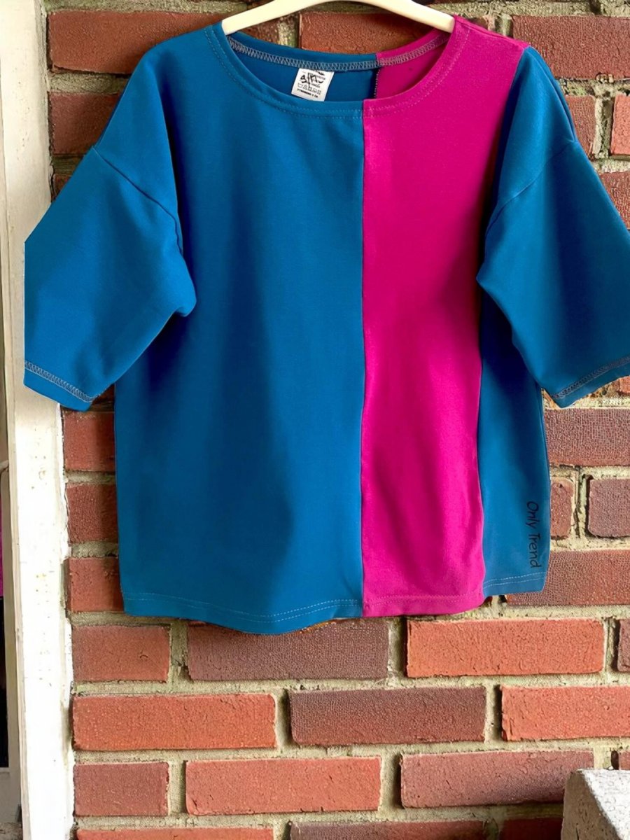 Originální triko v atypickém rovném střihu – zaujme na první pohled dvoubarevným provedením: magenta na jedné straně, teal na druhé. Krátký rukáv a bavlněná teplákovina zajišťují pohodlí i styl. Skvělá volba pro ty, kteří se nebojí být jiní.