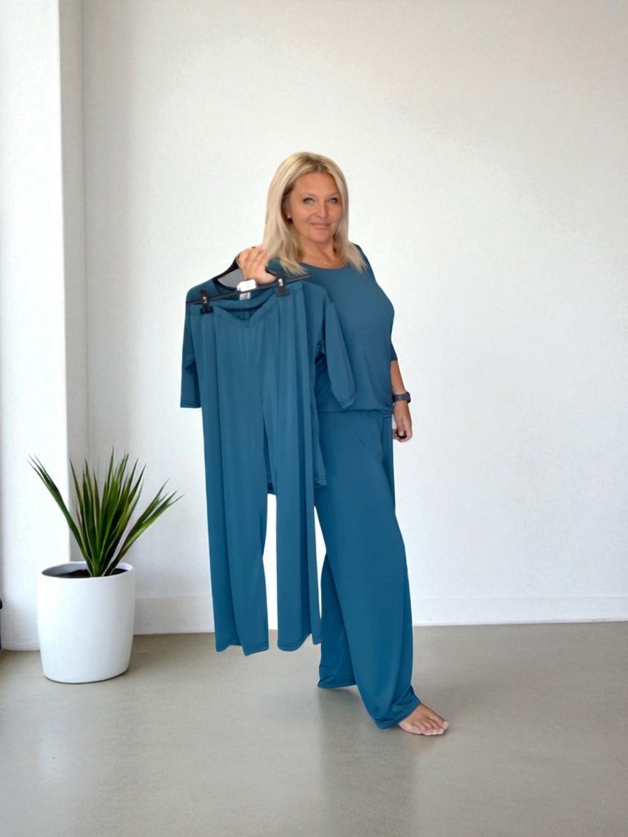 Stylový outfit v sytě teal odstínu, složený z trika s 3/4 rukávem a pohodlných kalhot do gumy, je dokonalou kombinací elegance a komfortu.