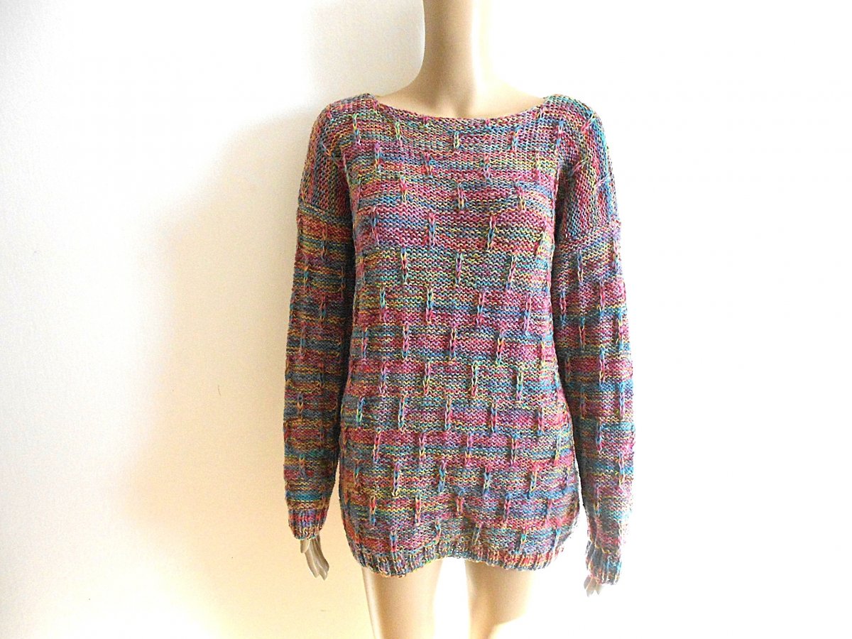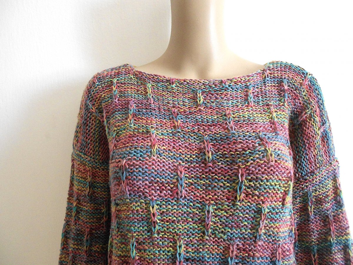 Dámský ručně pletený svetr, velikost M,L: délka 65 cm, šířka 52 cm - pruží, vnitřní délka rukávu 48 cm. Doporučuji jemné praní a sušit volně položené.