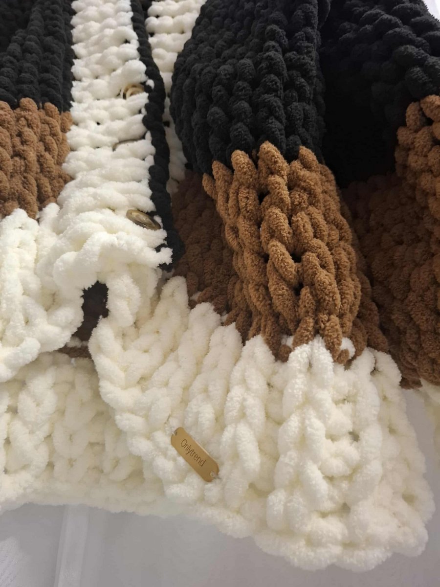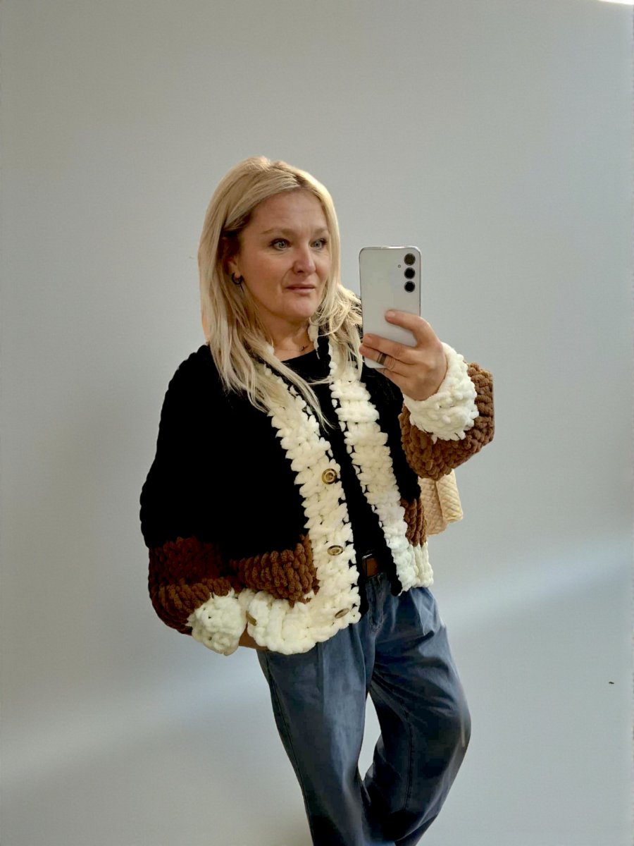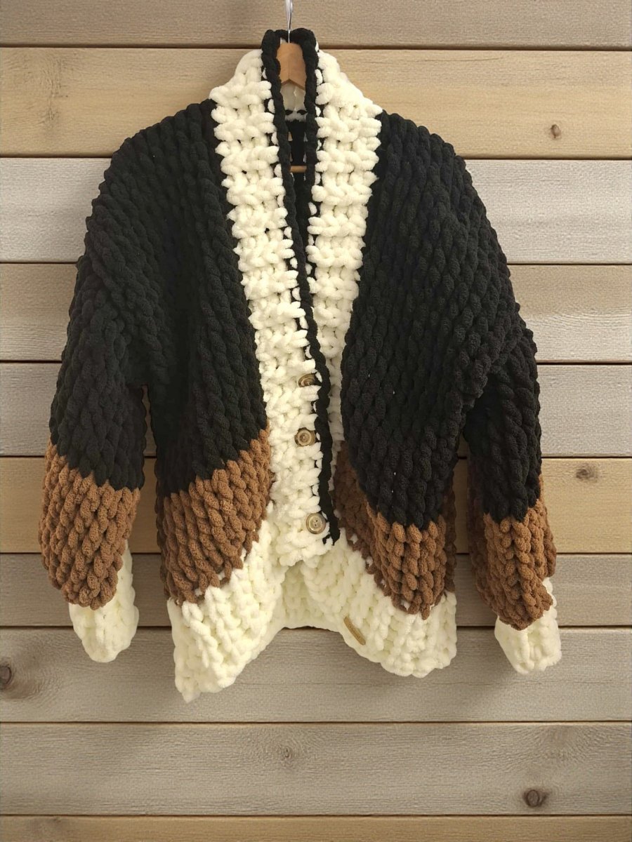 Praktické zapínání dodává svetru funkčnost a styl, velikost M/L padne pohodlně většině postav. Každý kousek je originál, pletený s láskou a péčí.
