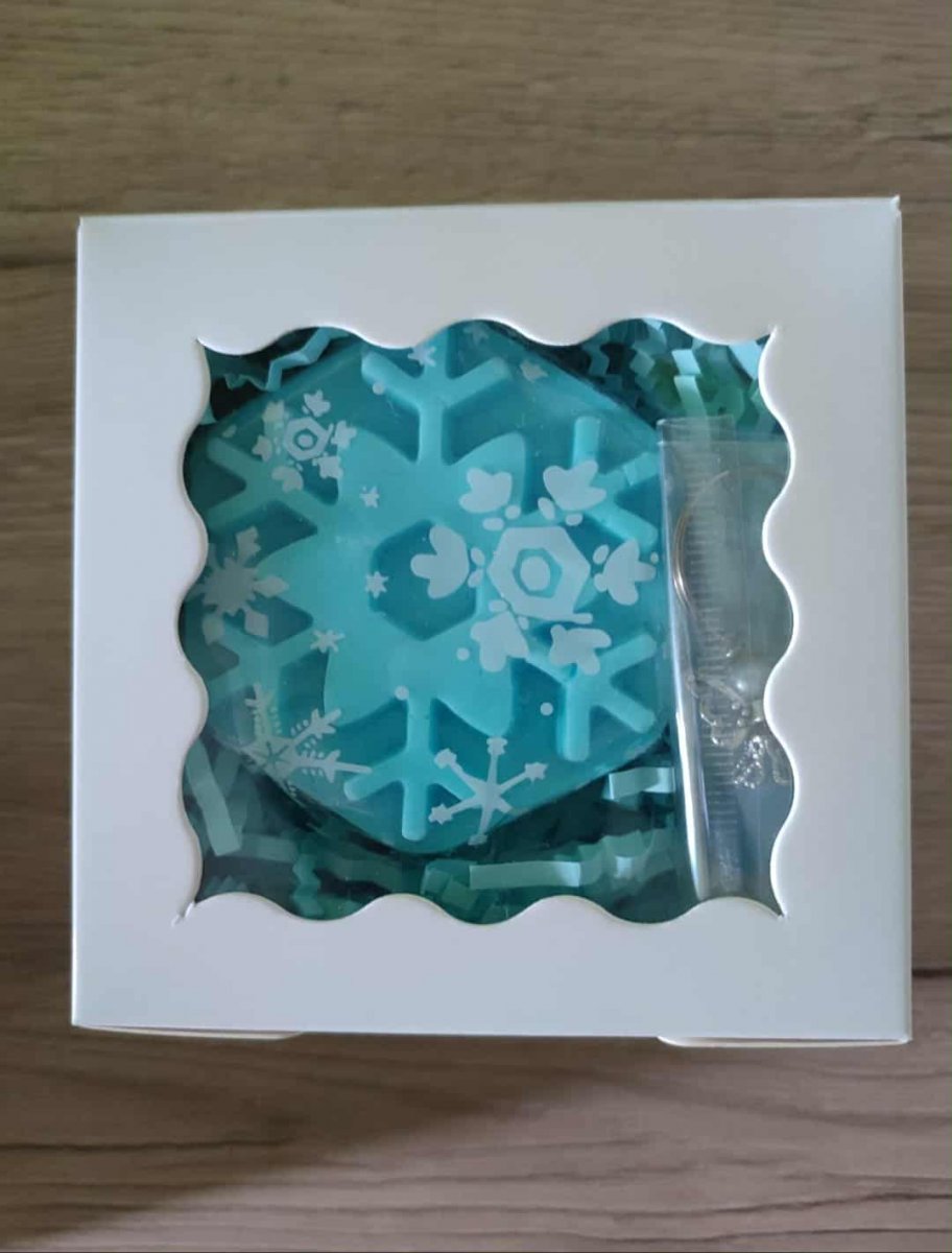 Malá dárková krabička, která obsahuje mýdlo ve tvaru vločky a klíčenku andílka.