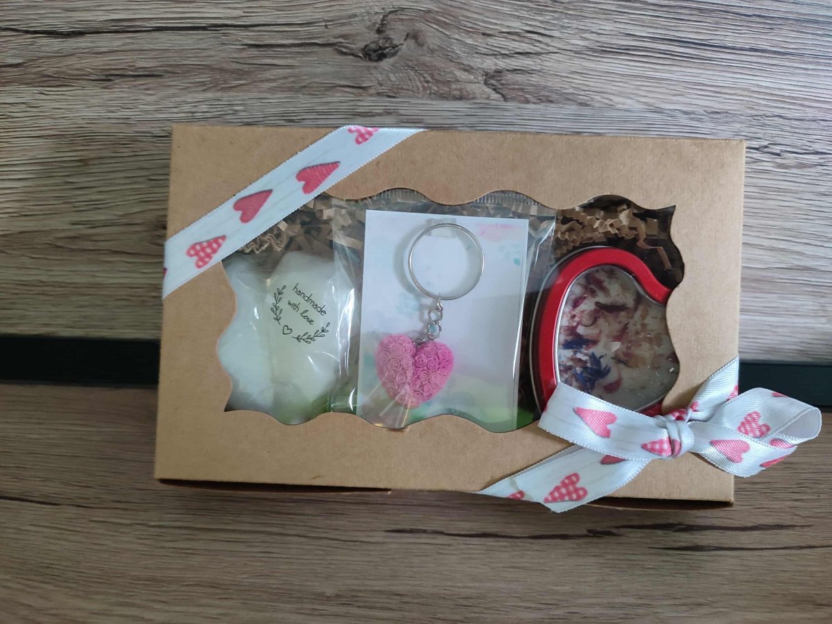 Dárková krabička obsahuje mýdlo ve tvaru srdce, klíčenku srdíčko a sójovou svíčku s voňavými kvítky.