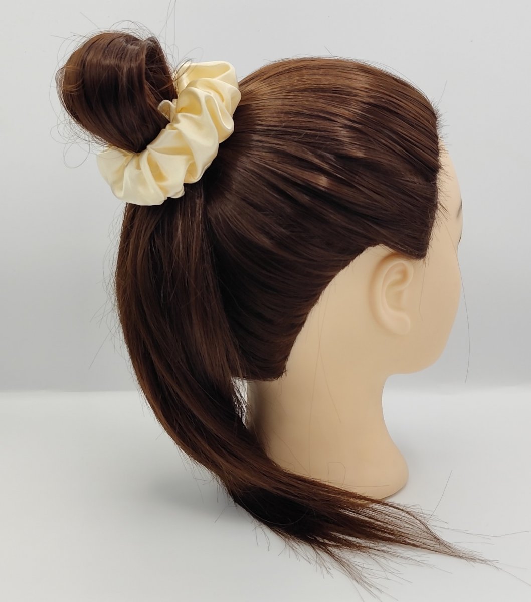 4x saténovou scrunchie gumičku velikost L - v klidovém stavu průměr 10 cm - šířka saténové látky 5 cm, uvnitř se silnou a pružnou gumou.