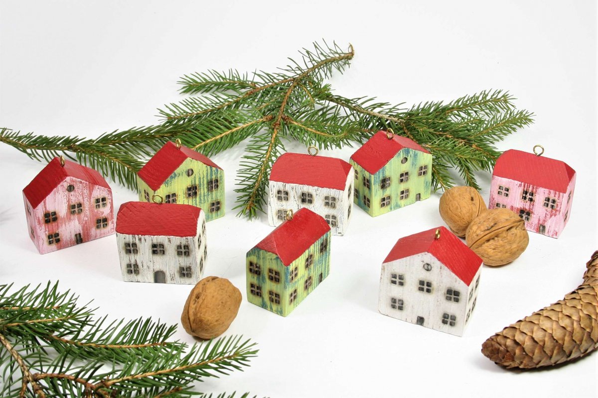 Sada dřevěných různobarevných domečků ze smrkového dřeva s ručně vyrobeným očkem z mosazného drátu k zavěšení.