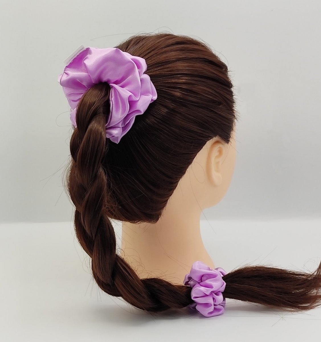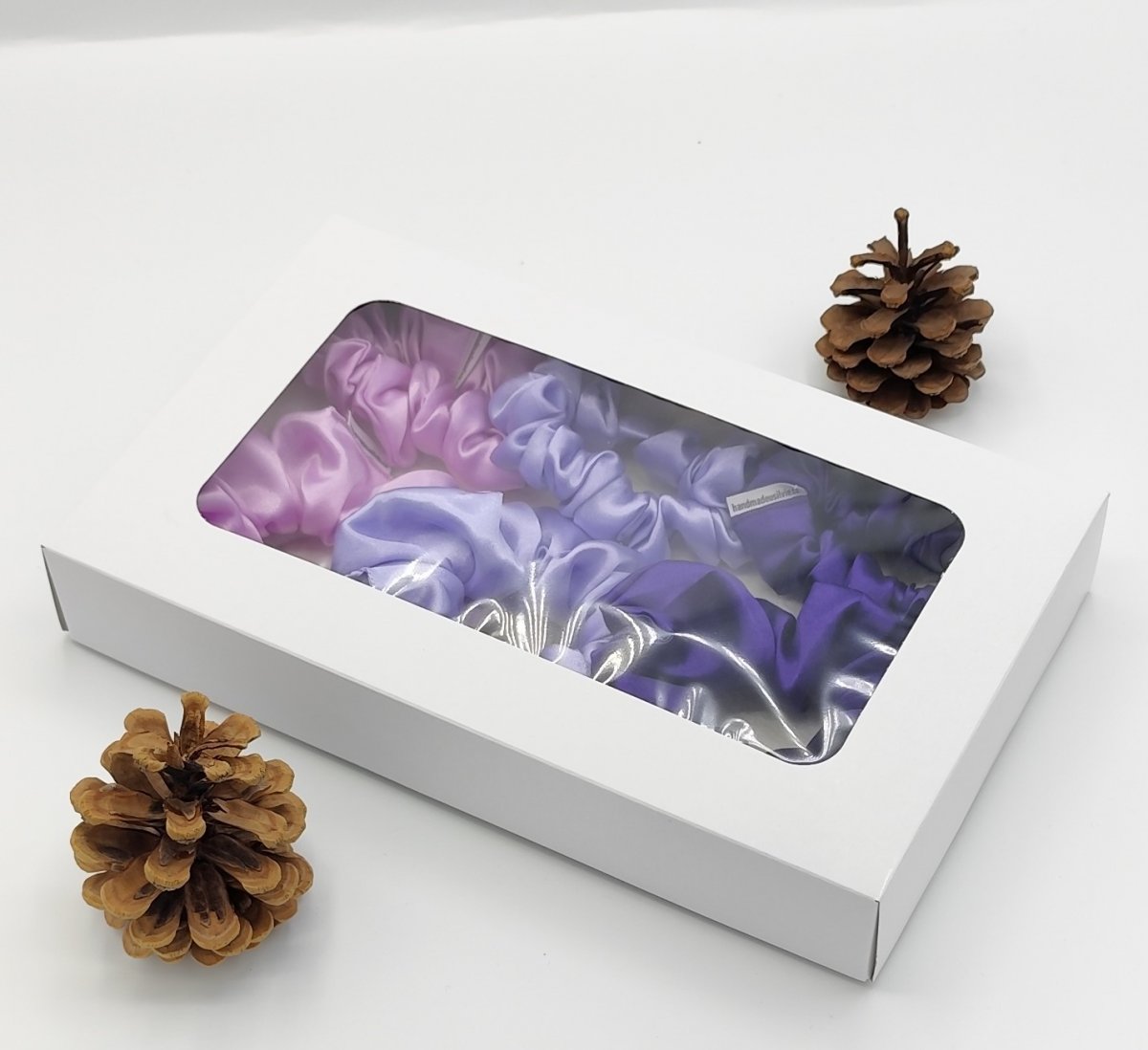 Dárková sada saténových scrunchies gumiček je nakombinovaná ve fialových barvách.