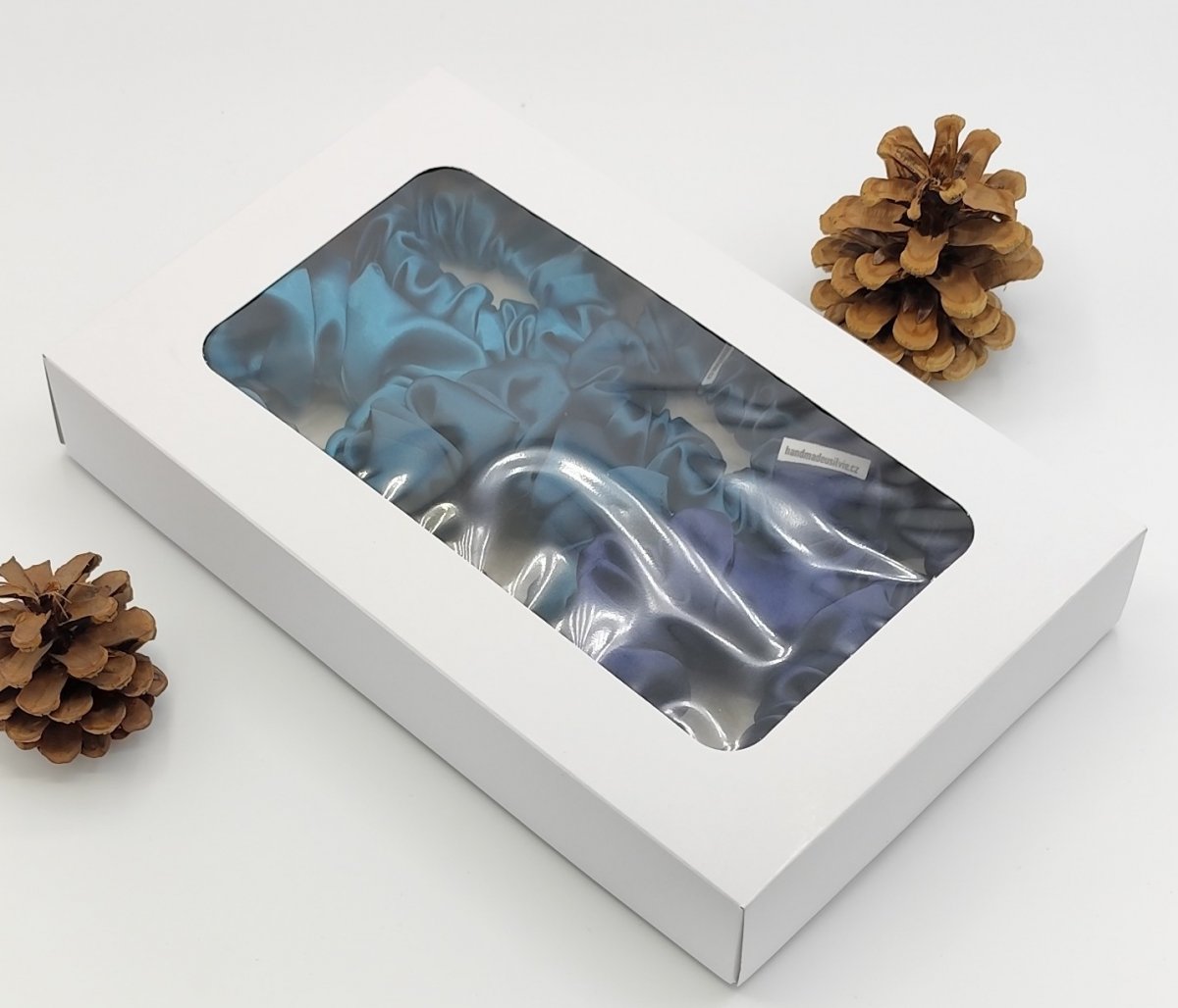 Dárková sada saténových scrunchies gumiček je nakombinovaná v petrolejové, tmavé petrolejové a temně modré barvě.