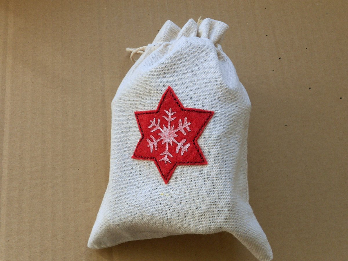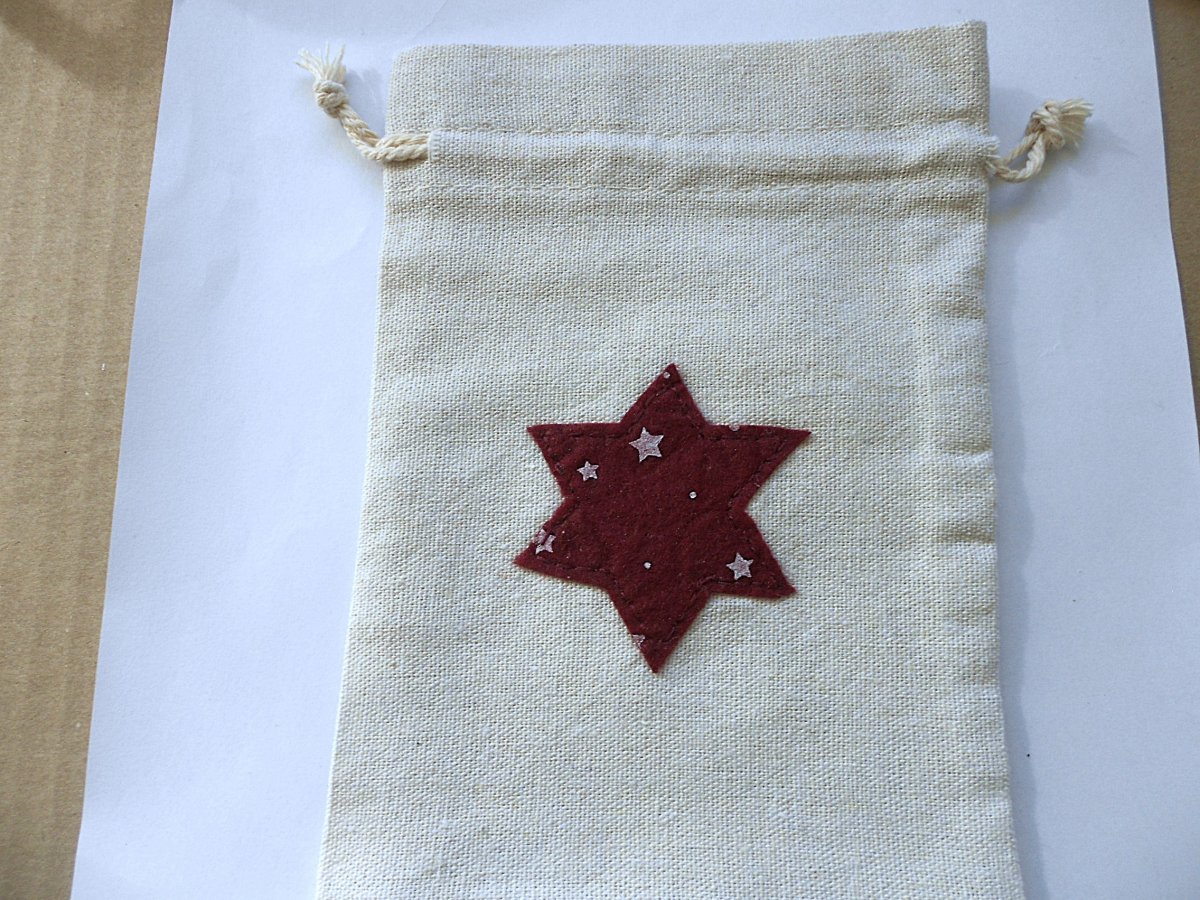 Lněný pytlík s ručně dělanou a přišitou aplikací hvězdy - 6x6 cm, je pevný. Snadno ho uzavřete pomocí dvou bavlněných stahovacích šňůrek, viz. 2. ilustrační fotografie. Na věci mnou vyrobené jde na přání přišít dřevěnou cedulku Hand made. Stačí poslat zprávu vnitřní poštou.