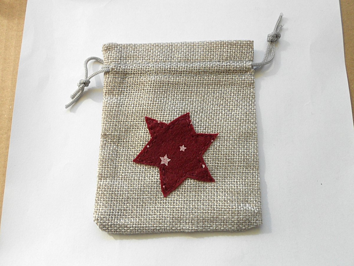 Dárkový pytlík připomíná svým materiálem přírodní jutu. Uvnitř je podšitý netkanou textilií. Snadno se uzavírá pomocí dvou stahovacích polyesterových šňůrek, šedý, ozdobený ručně vyrobenou a našitou hvězdičkou.