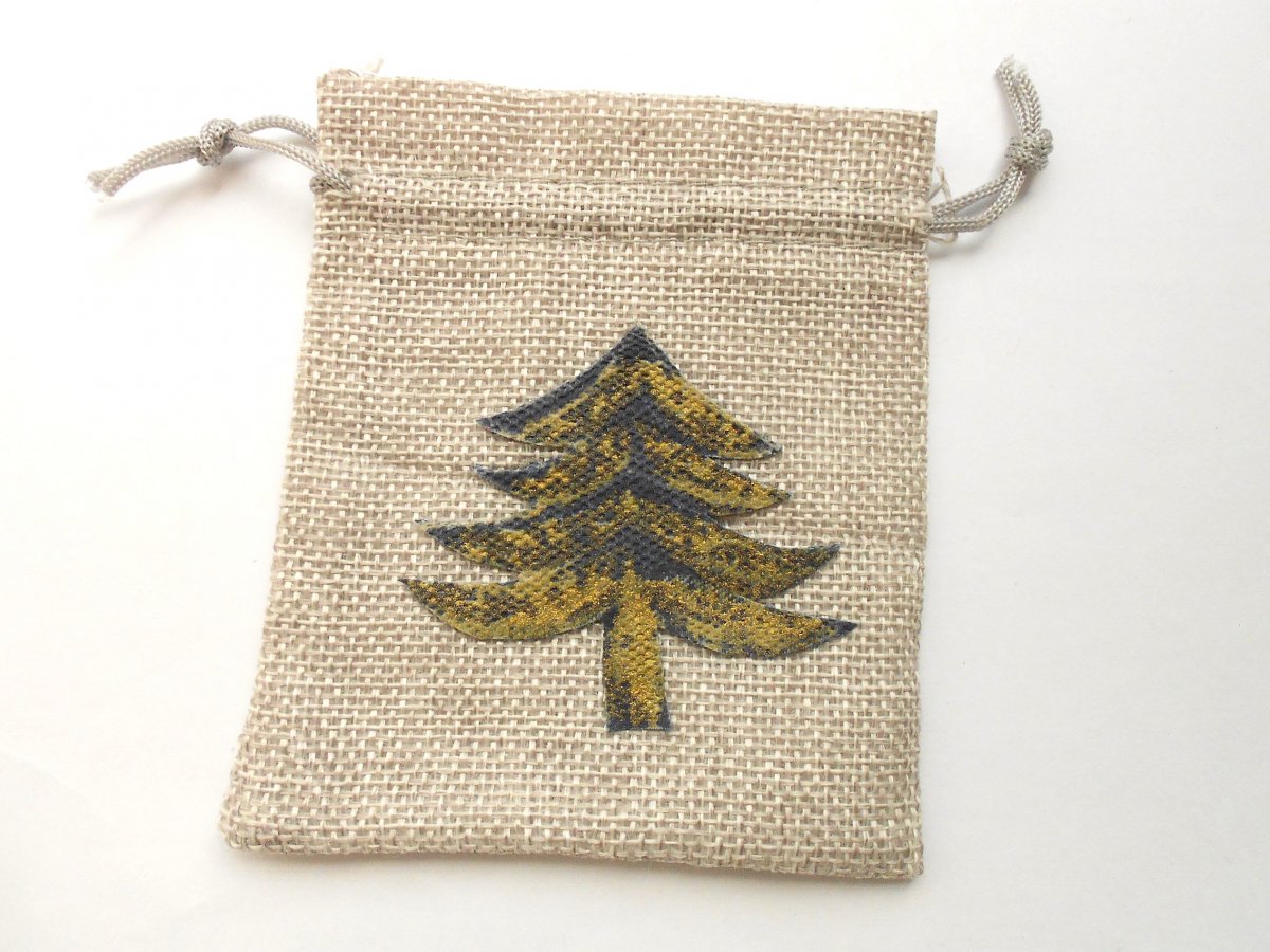 Dárkový pytlík připomíná svým materiálem přírodní jutu. Uvnitř je podšitý netkanou textilií. Snadno se uzavírá pomocí dvou stahovacích polyesterových šňůrek, šedý, ozdobený ručně vyrobeným a nalepeným stromečkem.