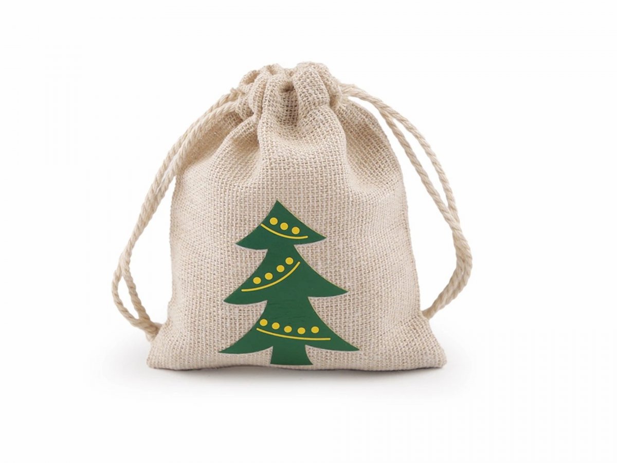 Dárkový, bavlněný pytlík připomíná svým materiálem přírodní jutu. Snadno se uzavírá pomocí dvou stahovacích polyesterových šňůrek, s potiskem stromečku.