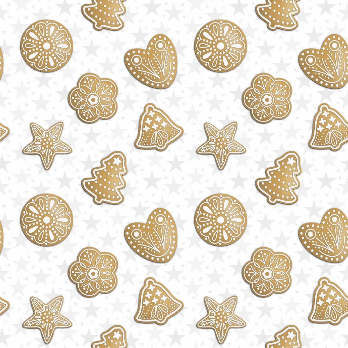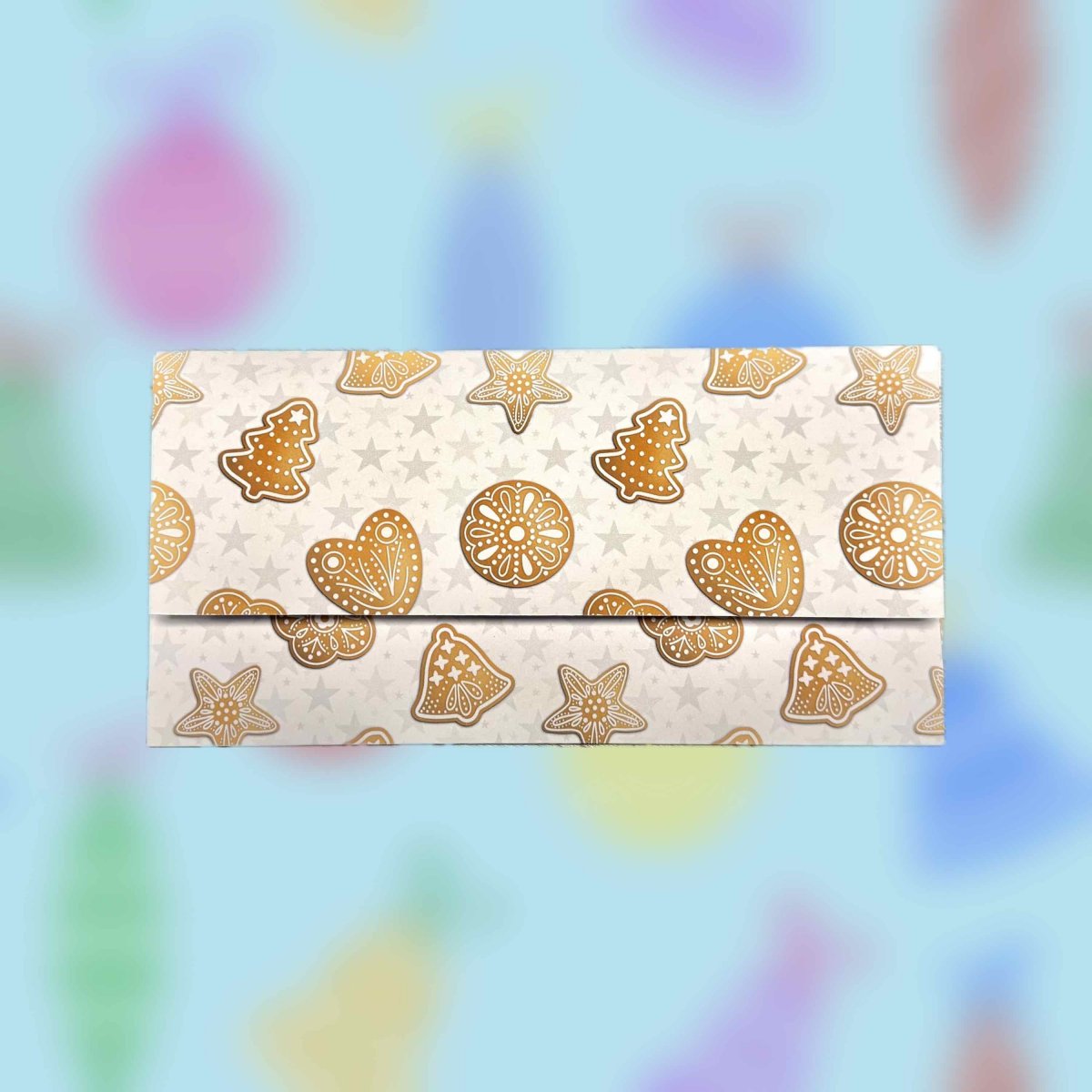 Darovací papírová ručně skládaná obálka s autorskou grafikou se zdobenými perníčky a stříbrnými hvězdičkami na bílém pozadí.