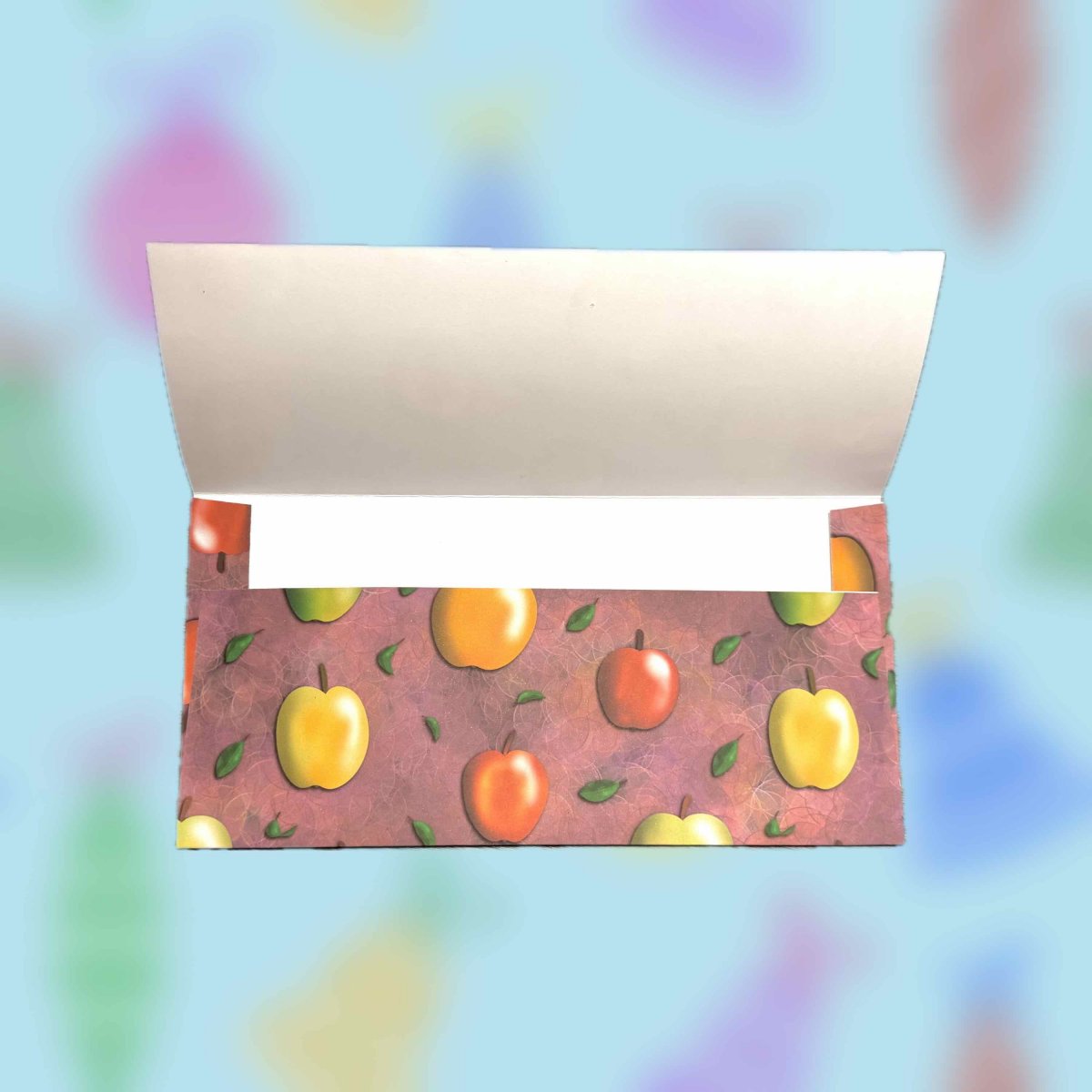 Darovací papírová ručně skládaná obálka s autorskou grafikou s barevnými jablíčky na starorůžovém pozadí.