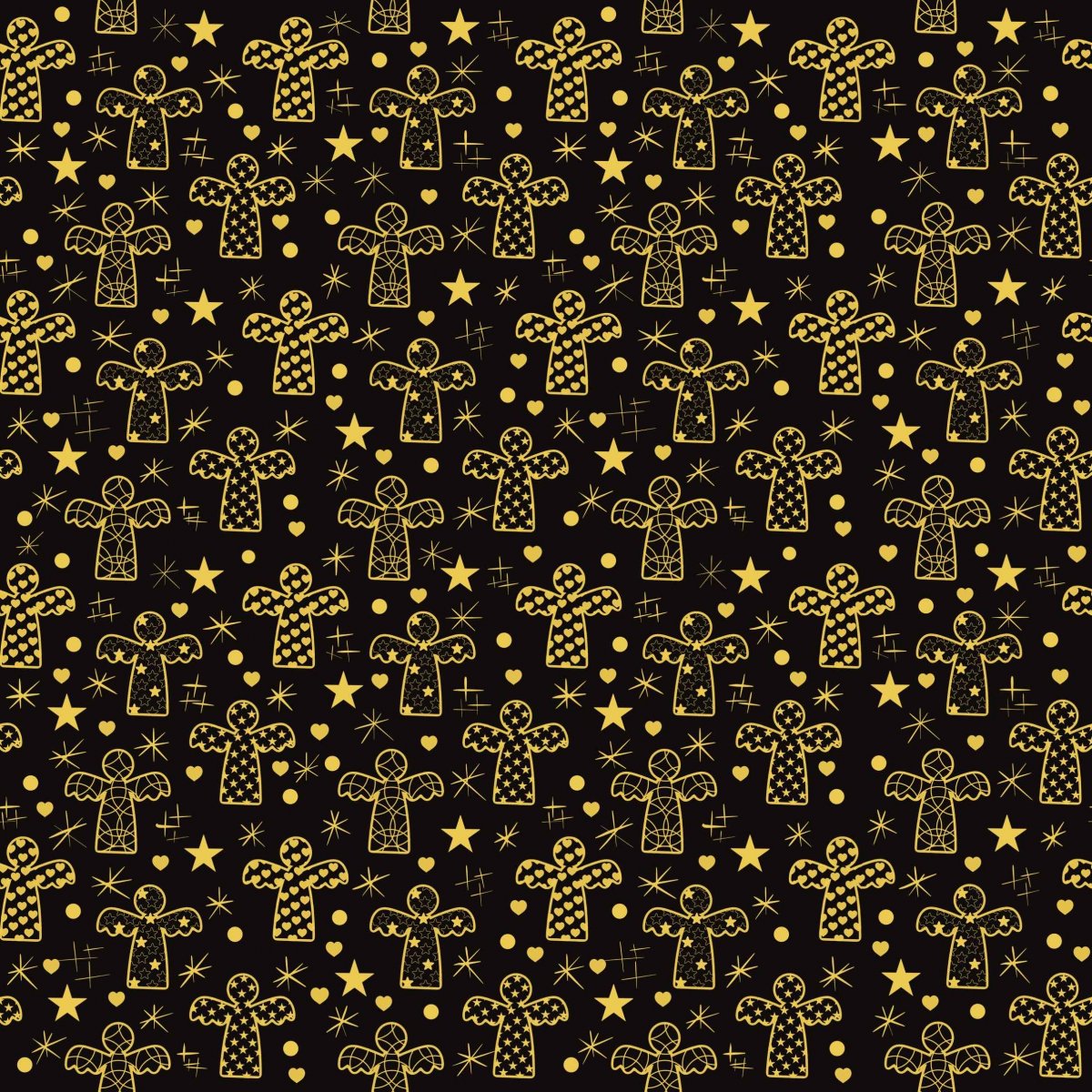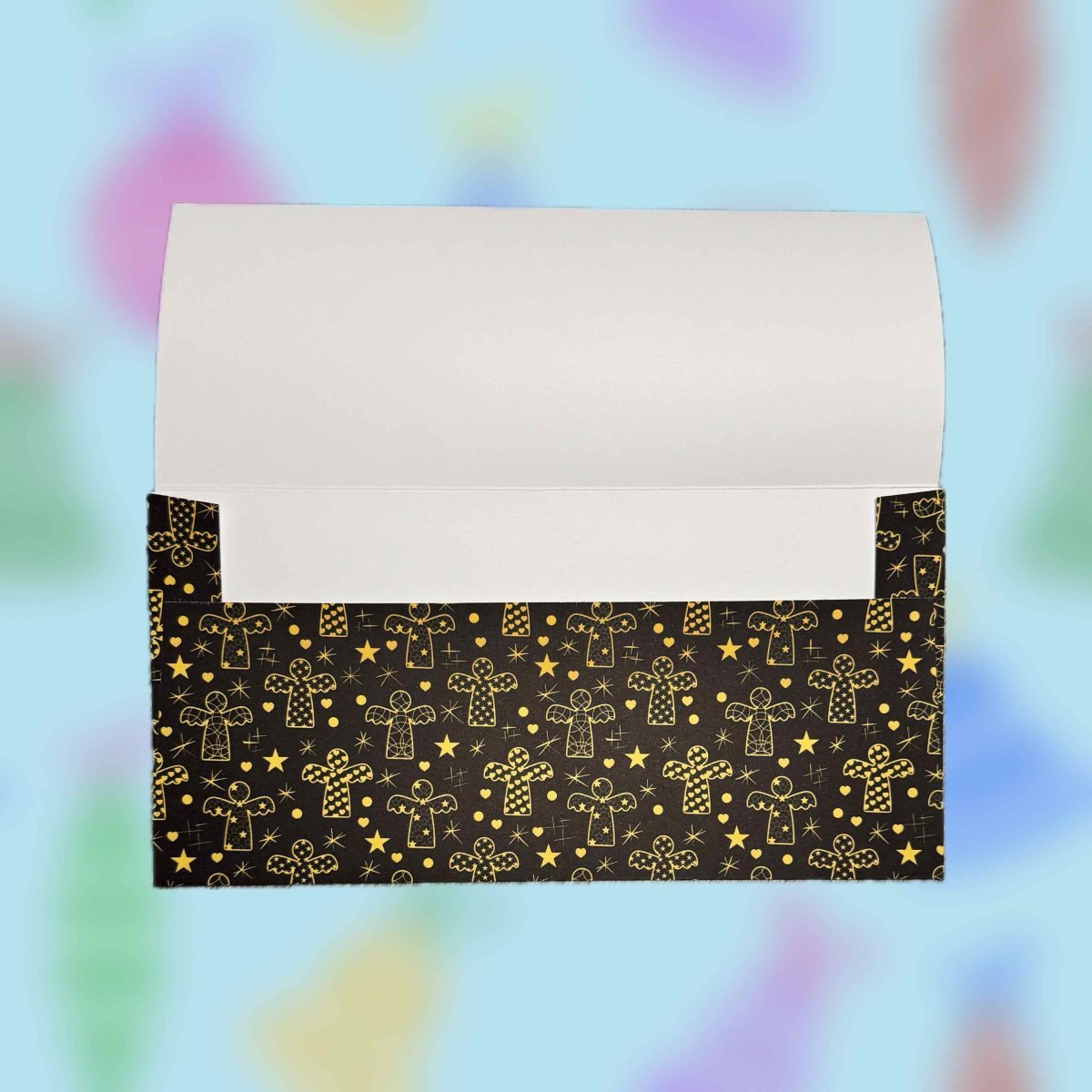 Darovací papírová ručně skládaná obálka s autorskou grafikou se zlatými andělíčky mezi hvězdami na antracitovém pozadí.
