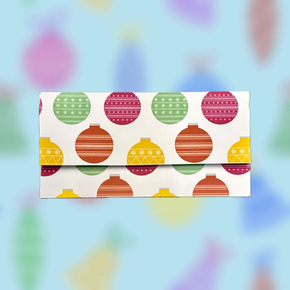 Papírová darovací ručně skládaná obálka s potiskem autorskou grafikou s vánočními ozdobami - koule na bílém pozadí. Velký vzor. Obálka z bílého papíru gramáže 160 g/m2 s inkoustovým potiskem.